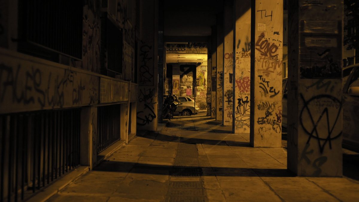 Malgré des prémisses essentiellement politiques et sociologiques, le film de Nadine Gomez arpente un terrain philosophique et, dans une certaine mesure, mythologique. En son centre, Athènes, ville de ruines aux « caractéristiques magiques » et sujette à toutes les fantasmagories. Le film se déploie le temps d’une nuit, pendant laquelle la réalisatrice part à la rencontre des habitants du quartier d’Exarcheia – artistes, acteurs du milieu culturel, militant et passants anonymes – multitude de figures qui se font l’écho de la vie du quartier. Présence discrète mais toujours sensible derrière sa caméra, Nadine Gomez filme Exarcheia avec une subjectivité juste assez appuyée. Elle arpente le labyrinthe de ses rues à demi plongées dans la noirceur, entre dans les lieux clos que sont les bars et les salles de spectacle, capte à la fois l’ambiance visuelle et sonore du quartier. Un certain effet décousu dans la structure du film, ainsi qu’un parti-pris d’opacité reproduisent bien les paramètres qui sont ceux de l’expérience vécue. Ainsi, c’est également nous qui allons à la rencontre de l’autre, nous qui déambulons dans Exarcheia. Nadine Gomez propose une expérience qui devient alors bien plus qu’une entreprise documentaire ou informative au sens le plus strict du terme.