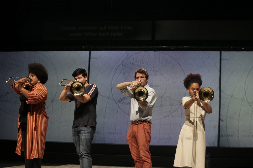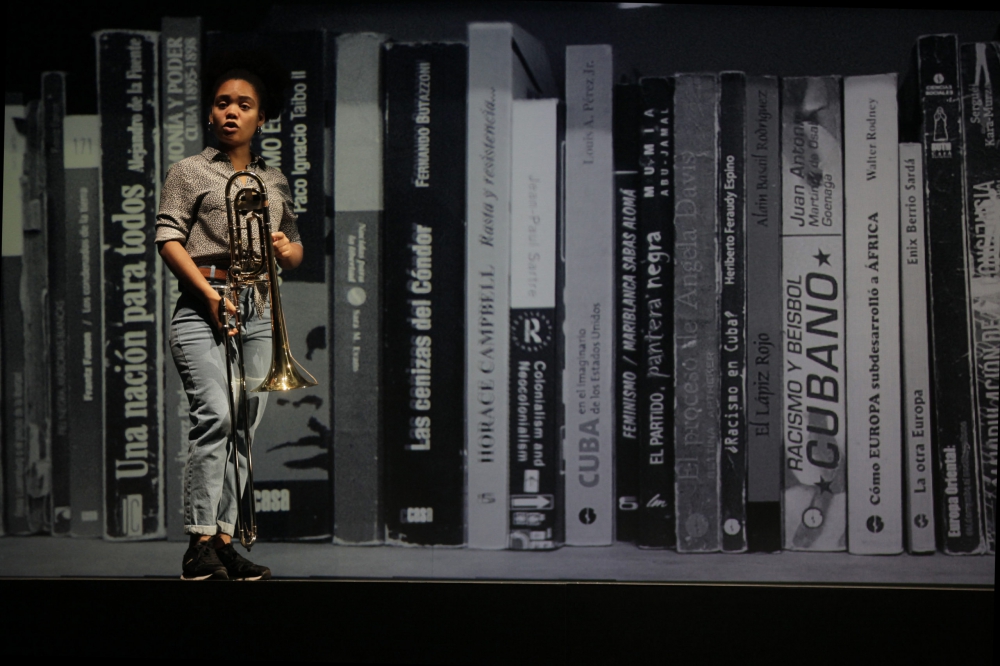 Durant la pièce, on découvre l’existence des mini-brigades cubaines : au cœur de la révolution, lorsqu’un pays entier était encore à bâtir, il n’était pas rare qu’un groupe de quelques personnes se forme autour d’un spécialiste pour apprendre les rouages d’un métier ou d’un autre. C’est ainsi que tout le monde, à ses heures, est devenu charpentier, agriculteur, etc. C’est pour refléter cette même dynamique que Diana Osumy Sainz, musicienne de formation, a montré à ses trois comparses à jouer du trombone, eux qui n’avaient jamais touché à l’instrument il y a à peine un an. Fil d’Ariane de la proposition, ces morceaux interprétés à l’unisson à de multiple reprises est l’un des symboles forts de la pièce, qui souligne l’entraide et met à l’honneur un certain champ des possibles. Parmi les bonnes idées, on note aussi l’inclusion d’une discussion intergénérationnelle, alors que sont projetées sur écran des entrevues faites avec les grands-parents s’adressant à leurs petits-enfants et relatant leur révolution. Le dialogue est vrai, touchant.
