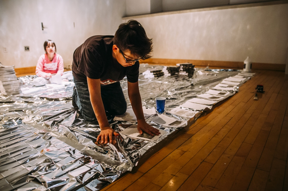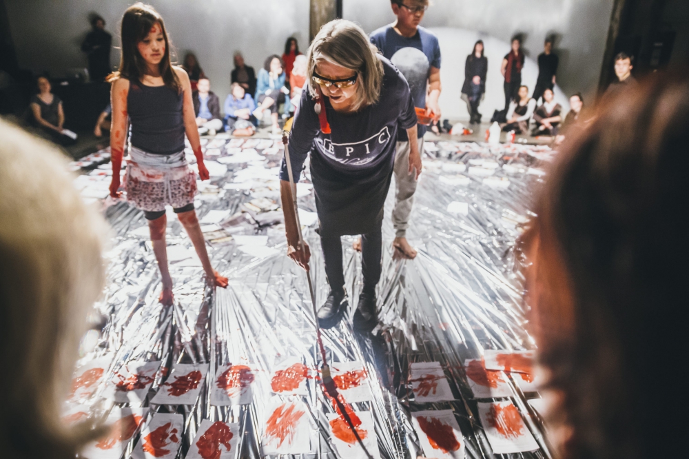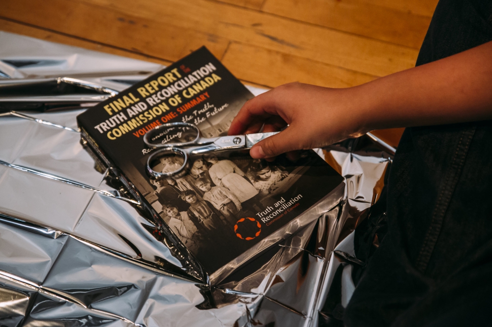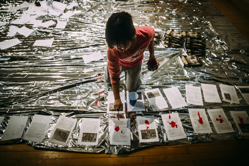 Les spectateurs sont assis autour d’un sol métallique, sur lequel sont déposés les rapports de la Commission de vérité et réconciliation. Ligotés au-dessus, six autres volumes sont suspendus. Suivant le discours d’ouverture de l’aînée, survivante des pensionnats, une petite fille déchire les pages des livres, marquant le lien et la rupture avec cet héritage douloureux. Qu’est-ce qu’une enfant peut faire, avec toute son insouciance, de ces mots et de cette réalité si durs qui l’entourent ? D’autres jeunes la rejoignent et collent les pages une à une sur le sol, resserrant et devenant à la fois le territoire scénique. De la peinture rouge recouvre les pages : sang sur le texte ou réappropriation de celui-ci ? Un homme et un garçon demandent à des gens de l’assistance de lire des pages du rapport et les enregistrent, à la fois pour nous faire prendre part au rituel, pour souligner et contrer la vacuité de ces mots, mais aussi comme s’ils disaient « Raconte-moi mon histoire, la connais-tu ? » Des femmes, munies de porte-bébés, regardent inquiètes autour d’elles.