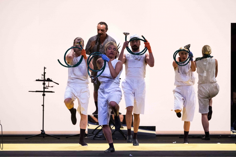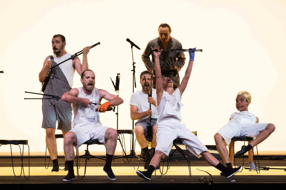 Sur scène, quelques tabourets épars, de multiples lutrins, un petit podium, divers micros et un miroir habillés d’un éclairage cru. Les danseurs revêtent de blancs habits accompagnés d’un maquillage burlesque, toujours grimaçant (les muscles du visage seront en complète extension durant l’entièreté de la représentation). Se présentant en divers tableaux qui s’enchevêtrent sans temps mort aucun, danseurs et musiciens passeront une partie de la soirée à se répondre, s’accompagner, se confronter et se chercher sur scène : deux bastions pour une seule jouissance. Dès les premiers tableaux, un moment d’extase : l’un des interprètes, habillé d’une chienne de mécanicien (et qui partage certaines allures avec le poète José Acquelin), entonne une pièce évoquant Tom Waits ; c’est fou, parfaitement déglingué – on est tantôt surpris, tantôt extatique, mais on garde toujours le sourire aux lèvres.