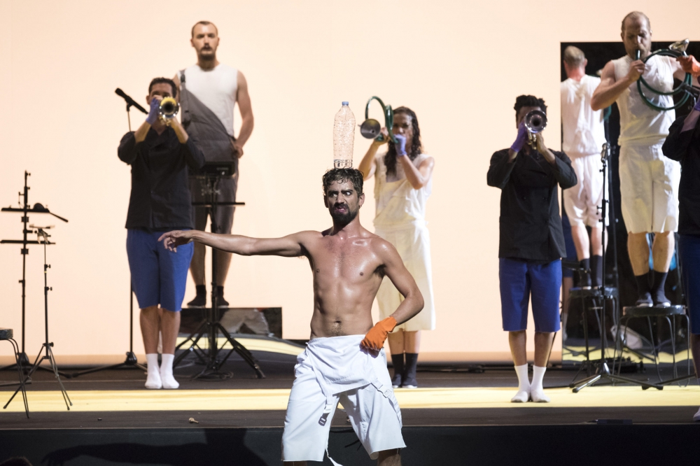 C’est un beau capharnaüm qui accueille les spectateurs dans la salle Ludger-Duvernay du Monument-National lorsque ces derniers font leur entrée pour assister à Bacchantes – Prélude pour une purge. Cinq trompettistes sont dispersés un peu partout dans la salle, alors que les interprètes sur scène l’arpentent en tous sen. Les mouvements sont saccadés, étranges, libres. Rapidement, on comprend qu’une fête orgiastique aura lieu – ou peut-être était-elle déjà débutée, bien avant notre arrivée. La purge annoncée passe clairement par la débauche et les extrêmes, et c’est avec le public (plutôt que sur invitation) que ces prêtresses de Bacchus célèbreront Dionysos. Dès que les lumières se tamisent, les fesses d’une des interprètes se transforment en chanteur le temps d’une performance, nous faisant ainsi sauter à pieds joints dans le grotesque. Les spectateurs sont désormais avertis : Marlene Monteiro Freitas n’aura aucune limite, et ça ne fait que commencer.