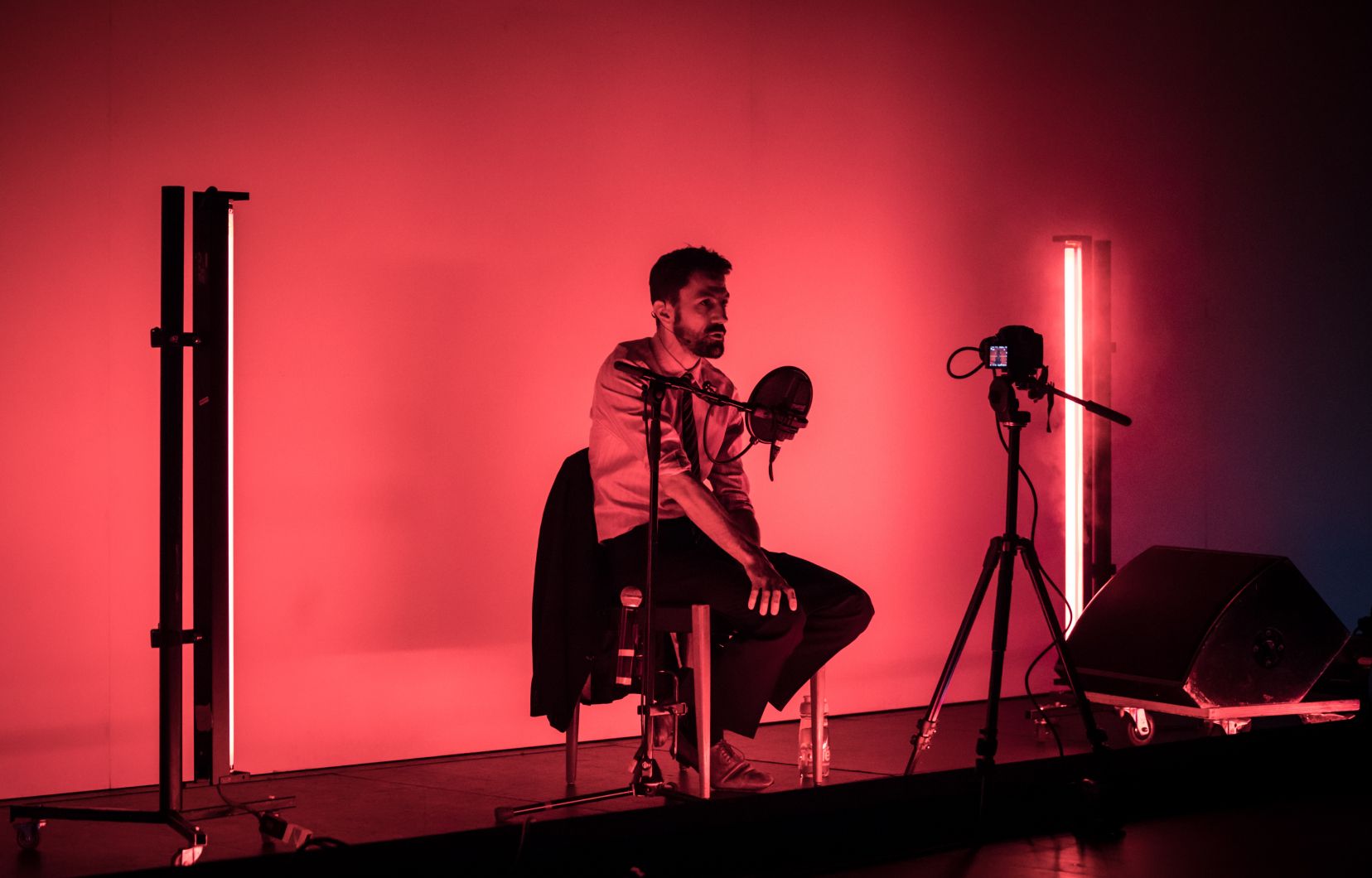 L’adaptation de Julien Gosselin réussit, avec une certaine économie de moyens, à rendre le dynamisme d’une nouvelle littéraire. Il faut voir que l’interprète se contente de réciter le texte de DeLillo, in extenso, avec de petits effets vocaux, plutôt retenus : la voix caverneuse pour jouer les répliques du voisin de box, la voix suraiguë (électroniquement modifiée) pour interpréter le délire économique des fillettes à la télévision (Dubaï ! Le nom à retenir est Dubaï ! Dubaï ! Dubaï !). Le spectateur doit rivaliser d’attention, s’accrocher à ce texte que véhicule un homme assis devant une caméra, plongé dans une lumière rouge qui rappelle un vivarium ; l’effort demandé peut paraître un peu pénible, mais le pari est plutôt réussi.
