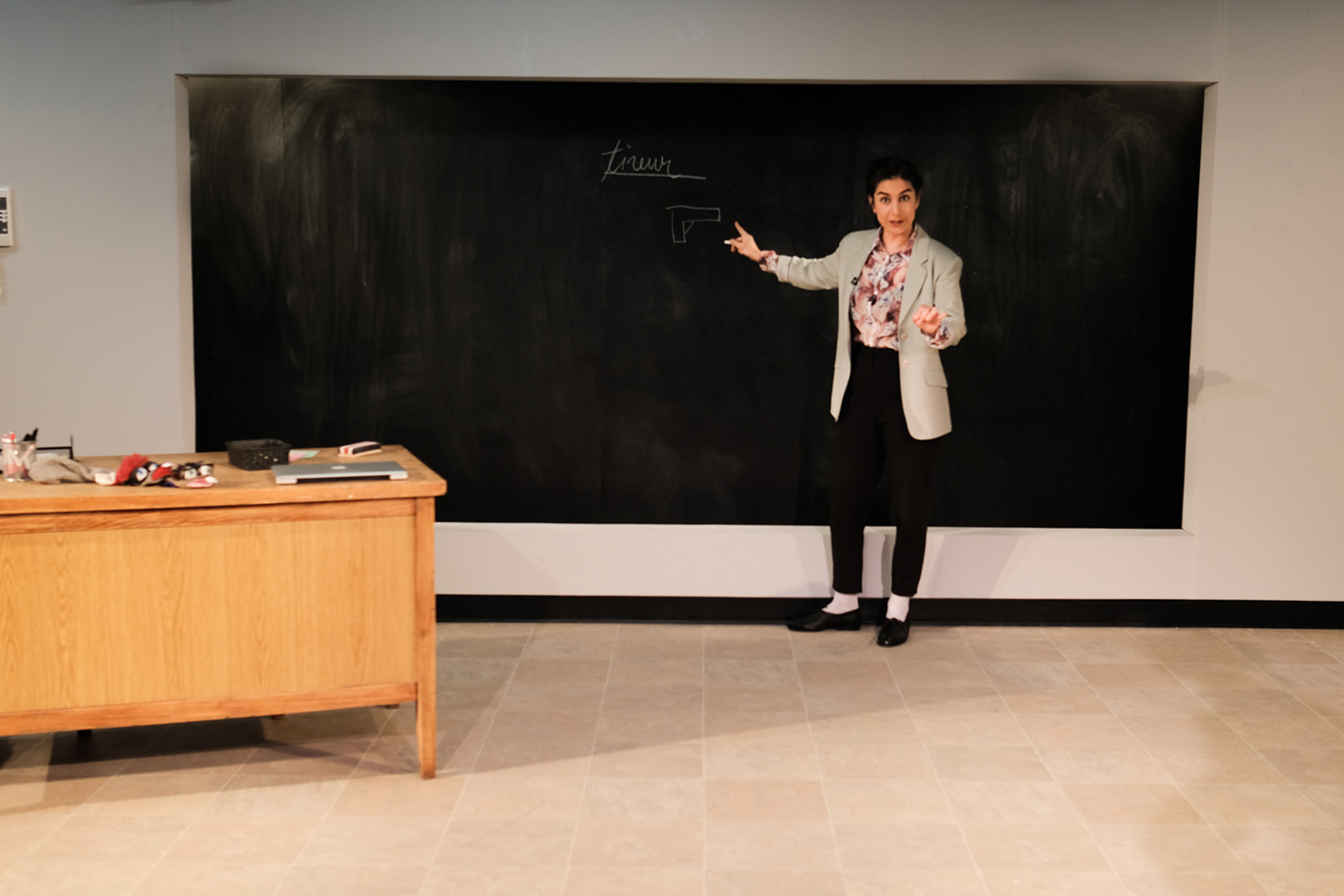 Il faut également souligner le travail du scénographe Cédric Lord, qui a conçu un décor ingénieux pour accompagner ce texte multidimensionnel. D’emblée, la salle de classe qu’il a réalisée remplit tout l’espace et nous plonge immédiatement dans l’action ; sa simplicité est au service de la mise en scène de John Lachlan Stewart. Mais plus encore, c’est par les détails qui se révèlent tout au long du spectacle que la scénographie prend tout son sens et que nous en captons toute la richesse. Une alternance de néons et de blacklights, par exemple, nous dévoile des éléments cachés : dessins violents en surimpression sur le tableau noir, empreintes de mains sur les murs qui suggèrent le chaos, etc. De même, un détail aussi subtil qu’un bricolage d’enfants affiché au mur prend, d’une scène à l’autre, une connotation nouvelle, insoupçonnée, troublante, et appuie brillamment la panique et le désordre qui s’installe dans l’esprit de l’enseignante.