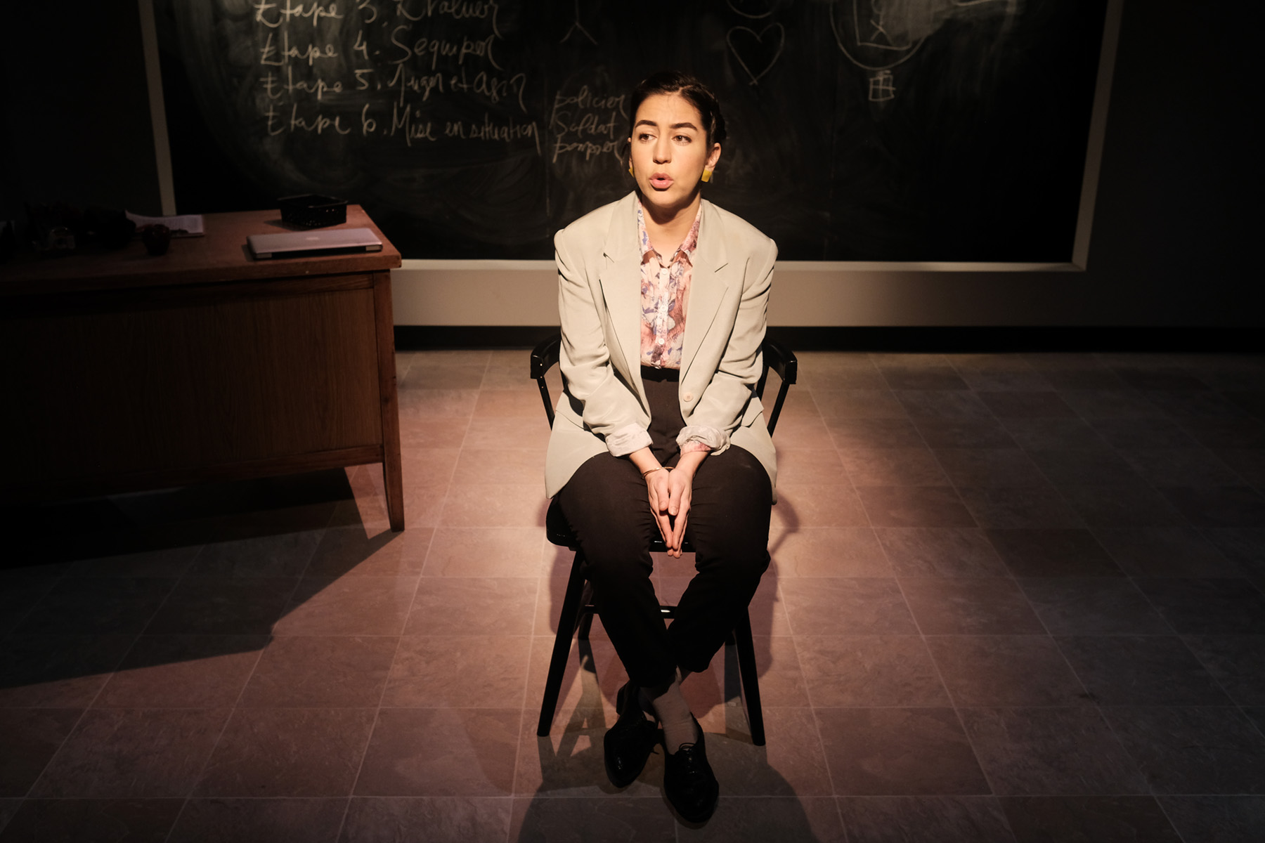 Au milieu de cet huis clos, la comédienne Alice Pascual, qui porte presque ce quasi monologue d’une heure à elle seule, est magistrale. Elle alterne entre la lucidité et la folie, la tendresse et la détresse avec une aisance remarquable. Il peut facilement être casse-gueule de présenter une pièce où les comédiens doivent interagir aussi souvent avec le public (dont les réactions et les réponses peuvent être aussi imprévisibles que réjouissantes ou dérangeantes), mais Pascual parvient à cerner et à maîtriser son public comme une enseignante d’expérience gèrerait sa classe, et ce, sans rupture de rythme ou de ton, même lors des moments où elle est obligée d’improviser pour remettre le récit sur les rails. En ce sens, sa performance est peut-être aussi bien un hommage à l’art théâtral qu’au métier d’enseignant, puisque les deux en viennent à se confondre dans l’espace de la pièce. Dans tous les cas, on ne peut qu’être admiratif devant cette interprétation toute en émotion et en contrôle.