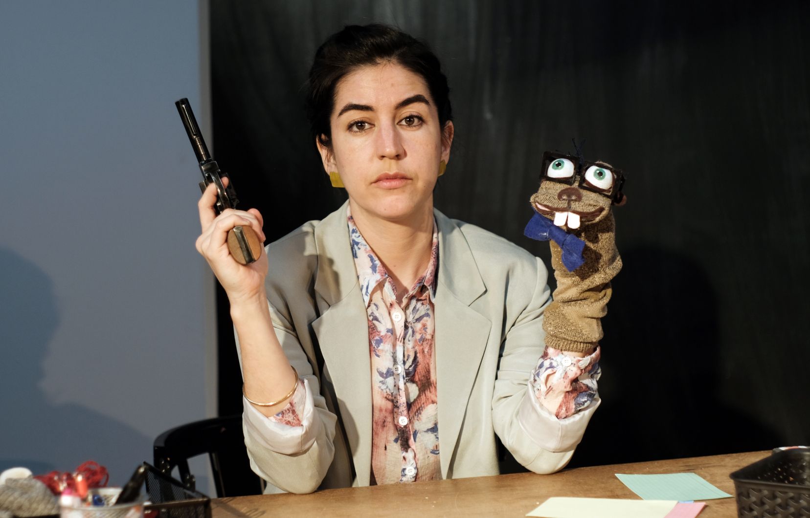 Et c’est bien l’une des forces de ce spectacle que d’arriver à nous confronter à notre désarroi collectif par le biais de la comédie. L’autrice albertaine Elena Belyea parvient à marier avec un dosage quasi parfait le rire et le drame, équilibre qui est d’ailleurs habilement transposé dans la traduction d’Olivier Sylvestre. La naïveté de l’enfant y côtoie ainsi le monde tragique des adultes : des marionnettes de castor se font abattre injustement par un chasseur, les visages des tueurs de Columbine, Polytechnique, Virginia Tech et Sandy Hook sont reproduits sur des masques, une chanson à répondre entraînante raconte les différentes étapes d’une tuerie, etc. En construisant le spectacle de cette façon, le metteur en scène a fait en sorte que les quelques moments réellement dramatiques de la pièce soient plus efficaces et déroutants.