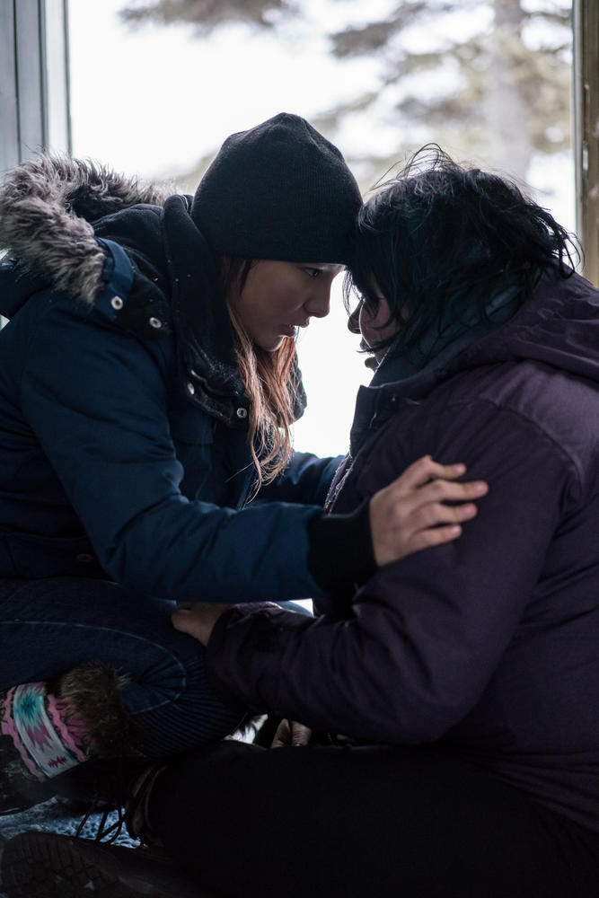 Aujourd’hui adolescentes, Mikuan (Sharon Fontaine-Ishpatao) et Shaniss (Yamie Grégoire) ont pourtant l’air d’être aux antipodes l’une de l’autre. La première rêve d’aller voir ailleurs, cherche à s’arracher (se déraciner plutôt, diront certains) d’un environnement qui l’étouffe. La deuxième, vieillie prématurément par des années de misère, vacille sans repères et interprète l’audace de son amie, celle de vouloir traduire ce qu’elle ressent par l’oral ou l’écrit, pour de l’arrogance, y voit la trace d’un sentiment de supériorité. Que Mikuan soit tombée amoureuse d’un garçon de Sept-Îles (Étienne Galloy), un Blanc de surcroît, n’atténue en rien un sentiment de déloyauté envers leur communauté.