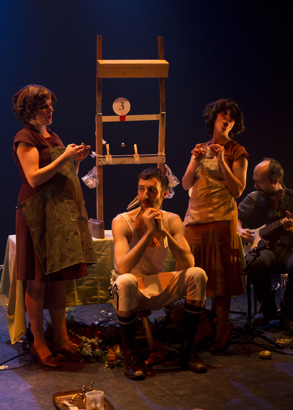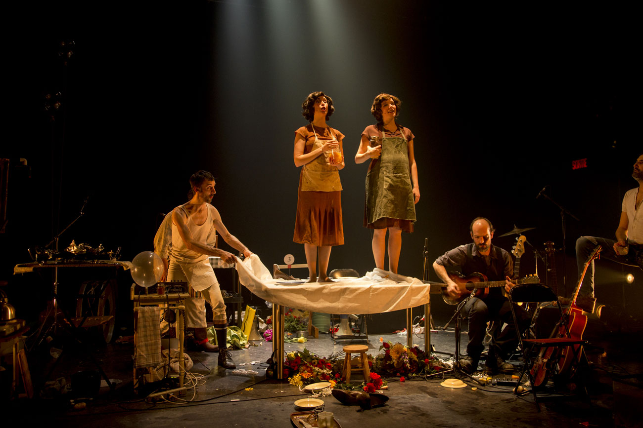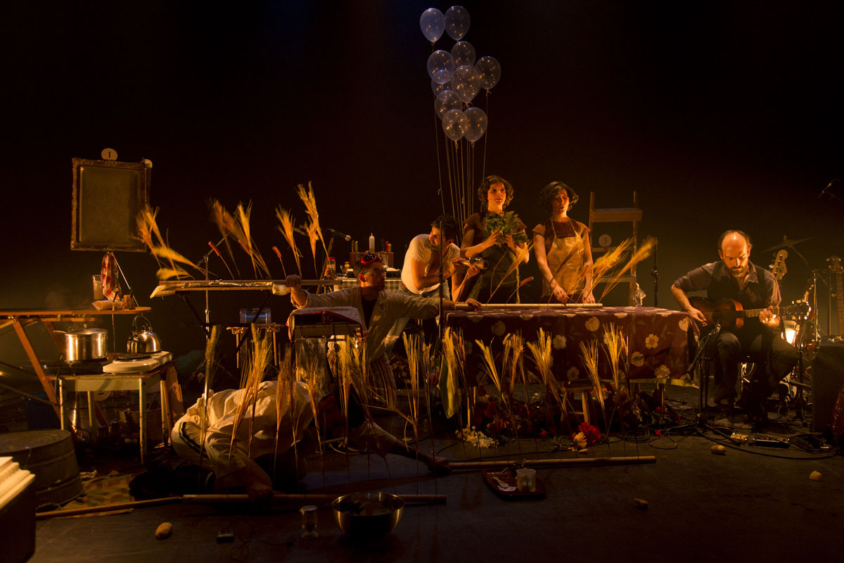 Poursuivant ses propres traditions, L’orchestre d’hommes-orchestres propose encore une fois un spectacle théâtral, proche du langage de la performance mais surtout de la performativité. La scène, où les détails créent des instants de grâce, est à nouveau remplie d’un apparent bric-à-brac qui sera tour à tour utilisé pour la musique et la cuisson, chaque objet étant réinventé pour remplir une nouvelle fonction. Tout dans l’installation contribue à créer l’ambiance de la chanson, mais pas seulement : les accessoires sont tout autant culinaires, puisqu’un « grand » repas se prépare au rythme enlevant de la musique. Chaque chanson devient une saynette dans laquelle on assiste à la préparation de mets ou à la représentations des gestes de la vie de cuisine – attente et cigarettes incluses.Micro sur râteau, drill épluche-patate, percussions sur corps et poulet, vieux téléphones micros… le son d’une époque et d’une culture hillbillie est recréé par des bricolages d’aujourd’hui. Intentionnellement loufoque, l’exécution des pièces n’en est pas moins hautement technique, voire même sportive par moment. Une tension proche de l’urgence anime les musiciens performeurs mais elle demeure festive, joueuse et juste assez délinquante.