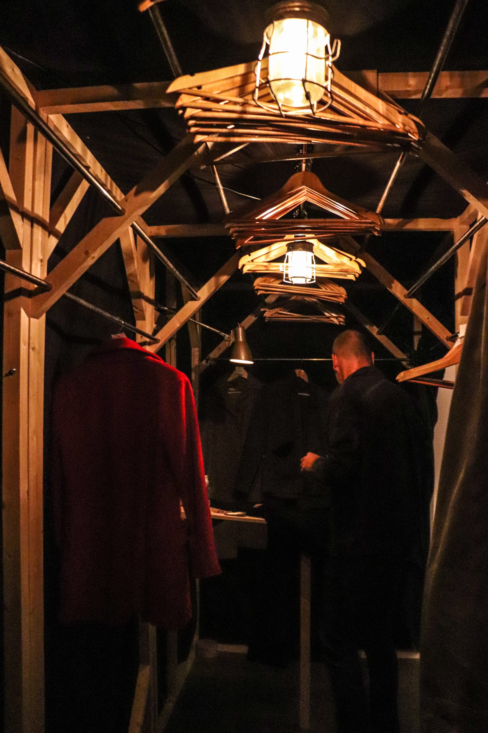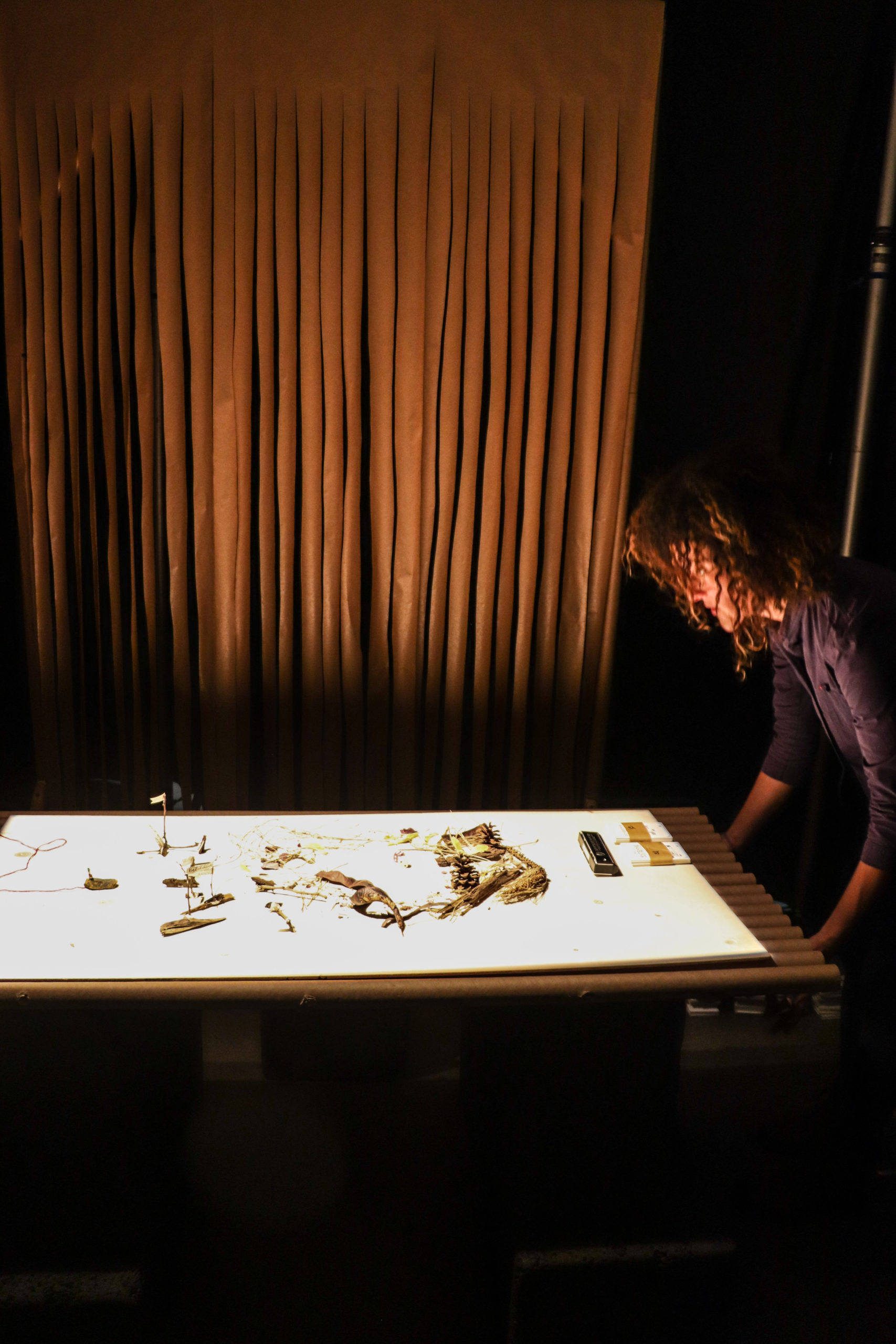 Dans l’exiguïté du placard, on fraternise rapidement avec ses voisins. On écoute raconter à qui appartient tel ou tel habit. On se défait de son manteau poussiéreux et on le place dans une des sections de son choix. Puis on nous dirige vers l’accueil. Là, on lance les dés et reçoit des cartes à jouer qui nous invitent à explorer le territoire (la salle est divisée en contrées, en chambre avec vue, en lieux d’expériences inouïes). Le public est éparpillé entre le Belvédère aux paysages kaléidoscopiques et la Roseraie où se concoctent des instants aux directives finement rédigées sur de petits papiers. Au laboratoire de vision on observe, déposé sur des surfaces lumineuses, dans un microscope ou une loupe à œilleton, « le pays qui n’appartient à personne »; au dortoir, on trouve un promontoire sonore d’où on épie ceux qui construisent, à l’aide de morceaux de bois, de ficelles et de cocottes, une « architecture inspirée des nuages ». Restent ceux qui, depuis « la cellule de méditation», regardent « la bibliothèque », ou encore ceux visitant « l’antenne parasymbolique », où les gens portent des casques d’écoute dans lesquels des grillons ou des histoires se font entendre. Tous sont absorbés, occupés à contempler les objets et les autres participants. On a l’impression d’être dans une maquette où chacun est l’étoile d’un plan indiquant « vous êtes ici, et là ».