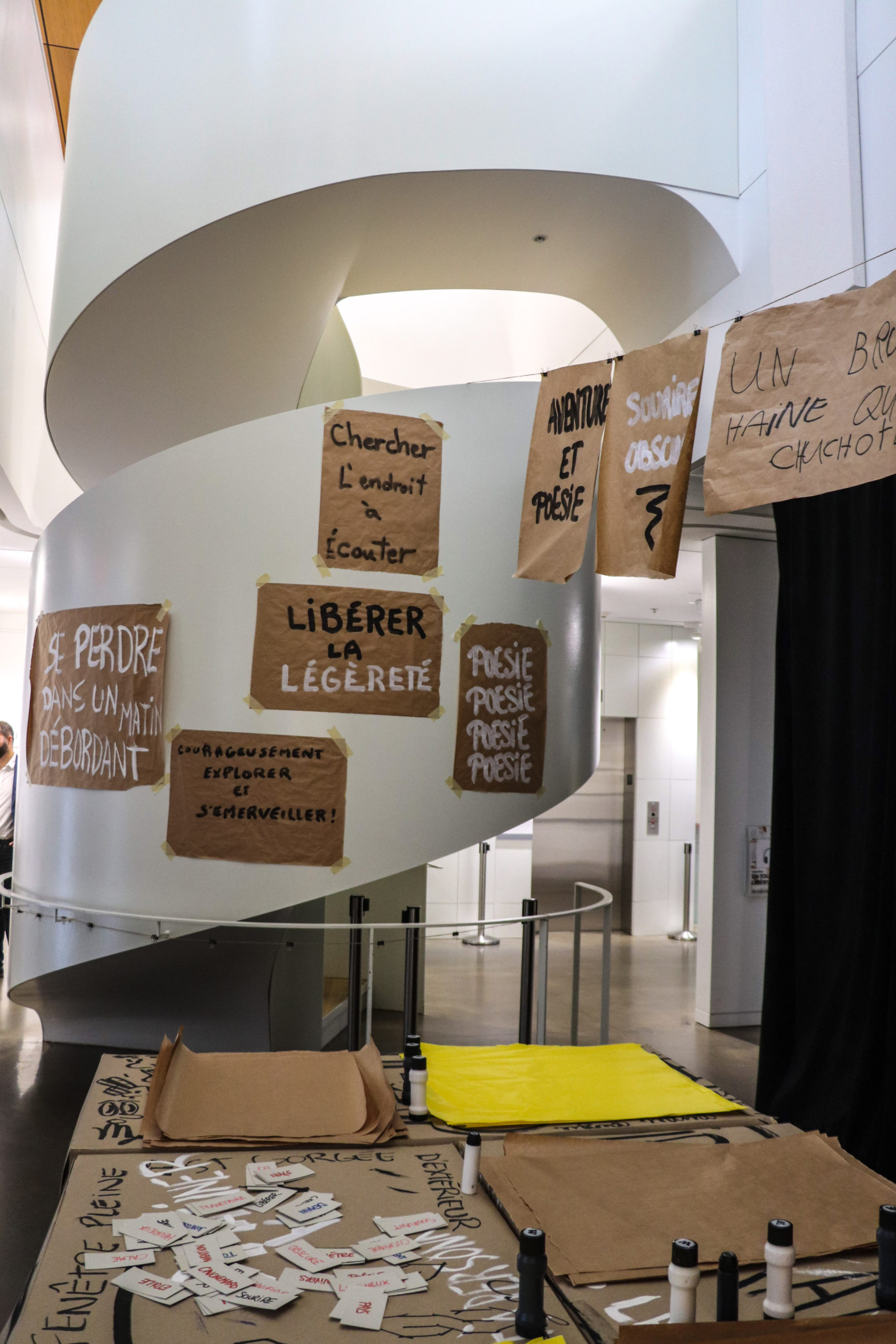 Dans le hall de la Maison de la littérature, le public du festival Québec en toutes lettres s’agglutine autour d’une table. On fabrique des affiches et on les suspend ici et là. Il y a des mots éparpillés sur la table, dans l’éventualité où les arrivants seraient en panne d’inspiration. Il y a surtout ceux, brandis, qui ont été rédigés à gros traits : « Libérez la légèreté », « Hier tout allait bien », « Va te faire poétiser », « Créez le soleil de demain » – la poésie en mode impératif. Son tour venu, chacun s’affaire à lire et écrire, puis est dirigé, au sein d’un petit groupe, vers le vestiaire. Il y a ici encore des mots qui tapissent le décor : « Pour s’effrayer d’un rien », « Pour se perdre dans le rêve », etc : passage de l’impératif à la suggestion ?