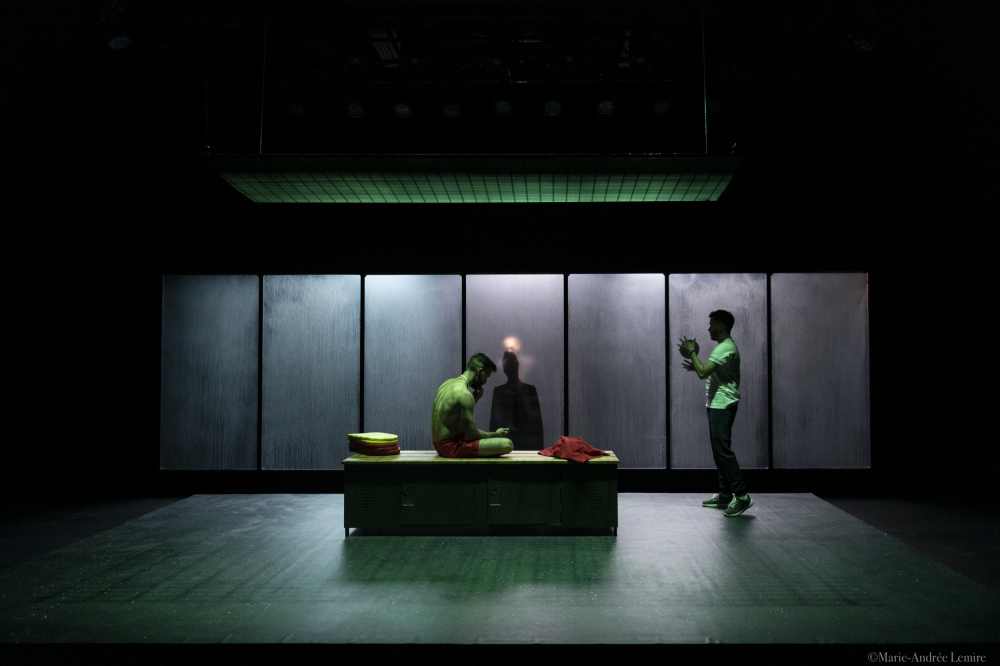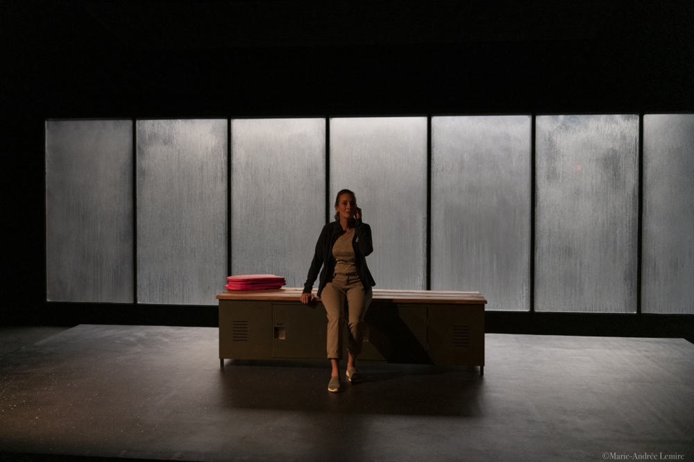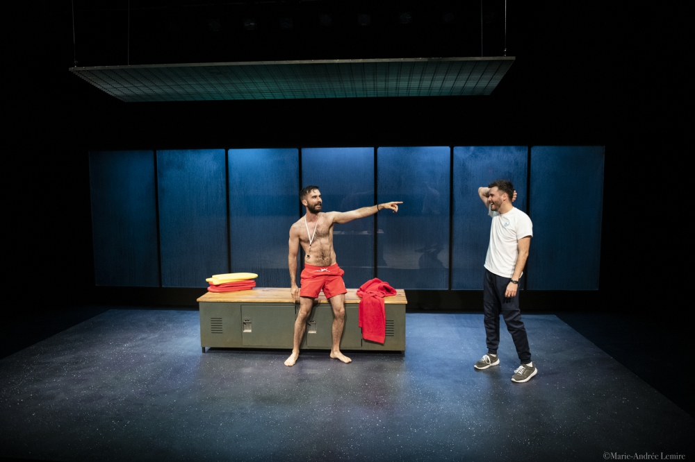 L’une des forces de ce spectacle est assurément le texte de Josep Maria Miro et sa structure non-linéaire. À l’image des vagues de la piscine municipale où il campe son récit, le dramaturge adopte une esthétique du ressassement. La pièce est composée d’aller-retour temporels alors que les scènes nous sont présentées dans le désordre, nous permettant petit à petit de reconstruire le fil des événements. La magnifique scénographie de Xavier Mary (accompagnée de l’efficace conception sonore de Benjamin Prescott La Rue) fait d’ailleurs écho à cette structure spéculaire par l’effet miroir qui est créé, en fond de scène, grâce à un mur de vitres parfois opaques, parfois réfléchissantes selon les éclairages.
