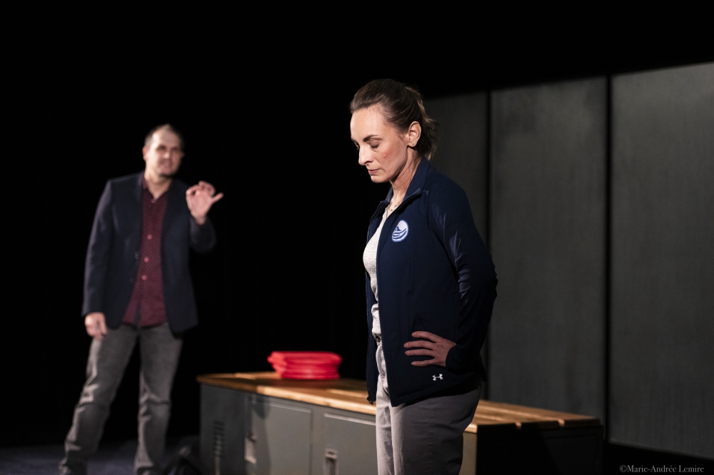 Les cris et les larmoiements sonnent alors faux, tout comme ces mains portées au visage pour marquer le désarroi, cette main portée à la nuque pour exprimer un malaise, ou ces mains levées au ciel en signe d’incompréhension. Enfin, le vide créé par cette scénographie minimaliste évoquant un vestiaire, bien qu’intéressant visuellement, ne semble pas bien servir la mise en scène ; il condamne les acteur·trice·s à inspecter des planches en styromousse, à ajuster artificiellement des flotteurs, à plier des serviettes ou à enchaîner des collations. Des éléments superflus qui distraient légèrement du texte et nuisent au rythme, souvent trop rapide, parfois pas assez.