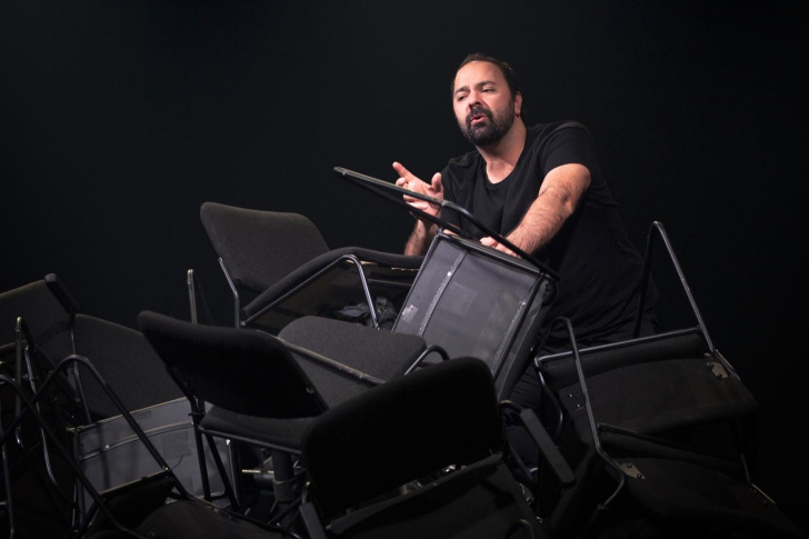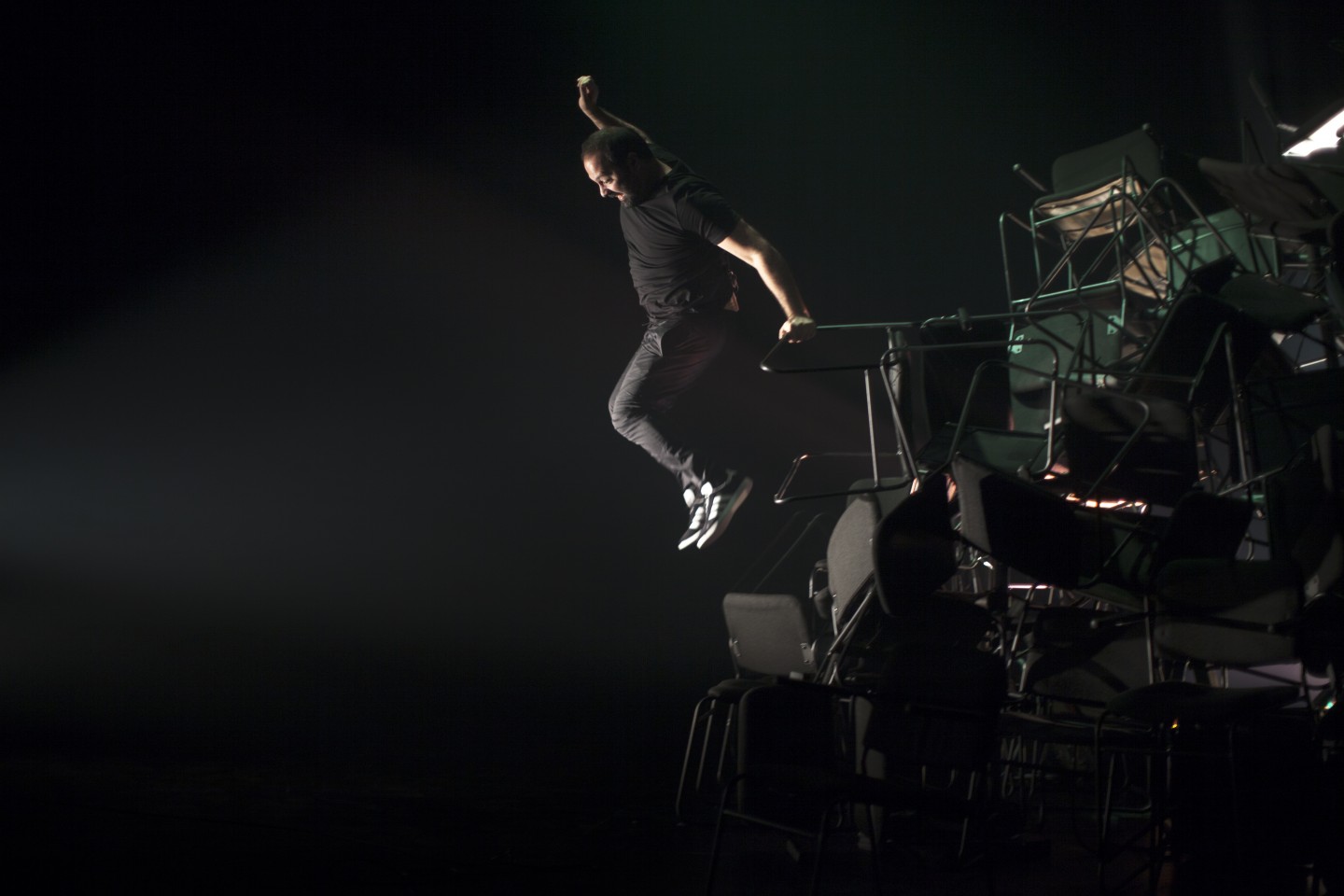 Évacuer en un spectacle une interrogation aussi complexe peut apparaître comme une entreprise difficile, voire impossible. C’est ce que suggère la scénographie : la quarantaine de chaises qui constituaient le décor de Trois sont ici entassées, formant une masse inextricable devant laquelle le comédien, armé de son seul micro, paraît bien seul. Dans cet amas métallique, on peut voir un symbole des questions sans réponse qui se sont accumulées de spectacle en spectacle, mais aussi la représentation d’un monstre typiquement contemporain : le réflexe identitaire, qui ne cesse de faire retour dans le débat public. Clairement dénoncé par Soleymanlou, ce réflexe empêche les individus de se définir autrement que par leur origine, au risque de l’enfermement et du schématisme, les « Souchiens » s’opposant artificiellement à ceux qui sont issus d’une diversité dont on ne sait pas exactement à quoi elle correspond, sinon à la volonté de tracer une frontière faussement rassurante entre « nous » et « les autres ».