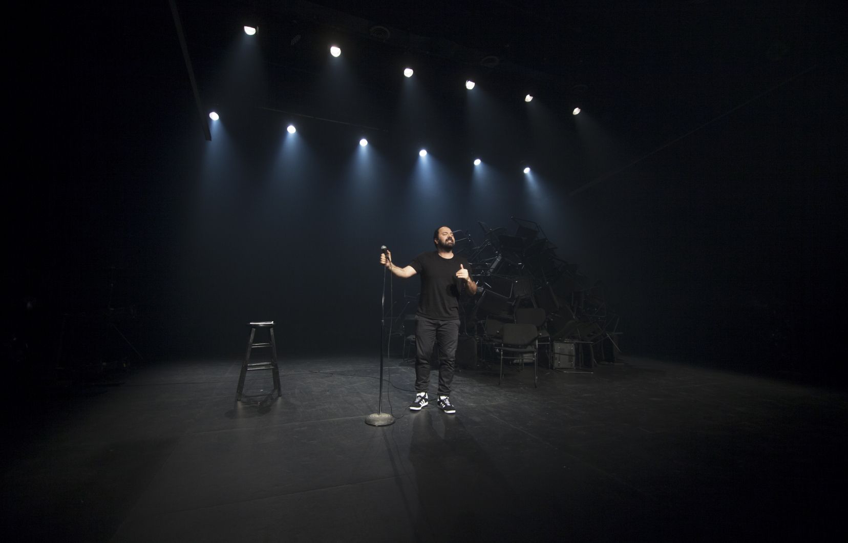 Zéro, précise Mani Soleymanlou dans les premières minutes de son plus récent spectacle, vient de sefr, c’est-à-dire « le vide » en arabe. En soulignant cette origine, le comédien expose d’emblée son projet : il s’agit de se délester dans l’espoir d’un nouveau départ.