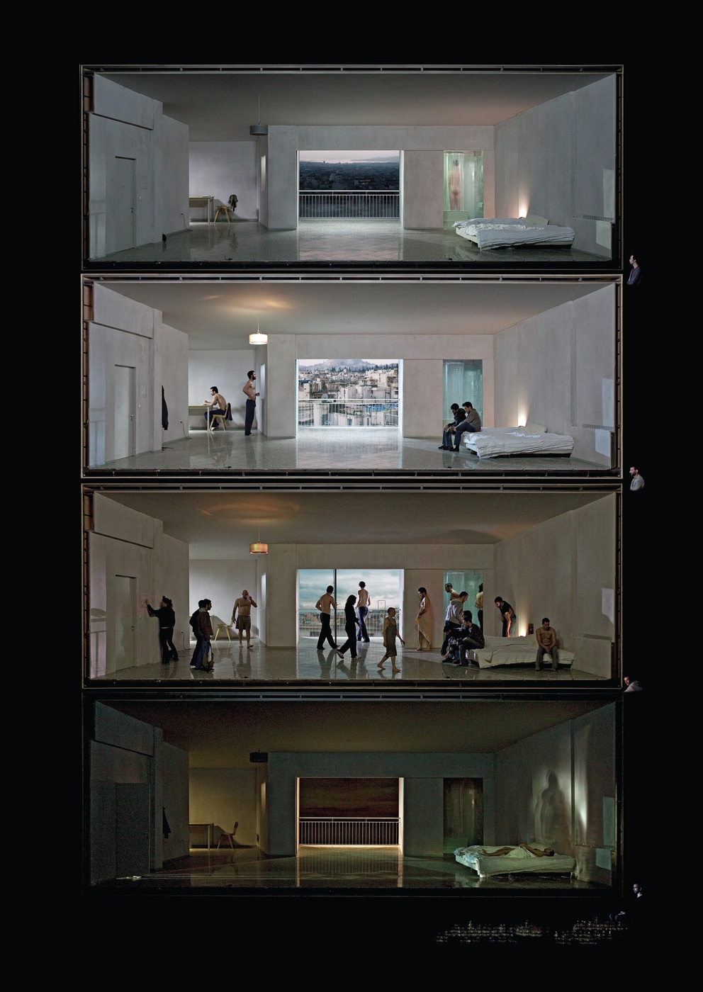 À la genèse de cette création, il y a le « geste ». Il y a, aussi, le désir de traiter le geste comme une phrase musicale, nous explique d’entrée de jeu Papaioannou. Inside pense le geste comme un matériau scénique, comme un atome, une unité à isoler : manger, se coucher, boire un verre d’eau, entrer dans son appartement, se laver, se sécher, se déshabiller, regarder par la fenêtre, s’habiller, uriner, déposer son sac, accrocher ses clés, regarder la ville depuis son balcon, ouvrir une porte, prendre un moment d’arrêt au milieu de son appartement. Ce qui change, au cours de la performance, ce ne sont pas les gestes mais leur séquence, leur « combinaison », comme le formule Papaioannou. Trente interprètes se succèdent et performent leur propre séquence en parallèle à celle des autres interprètes, ceux-ci se rencontrent sans se voir, sans se reconnaître.
