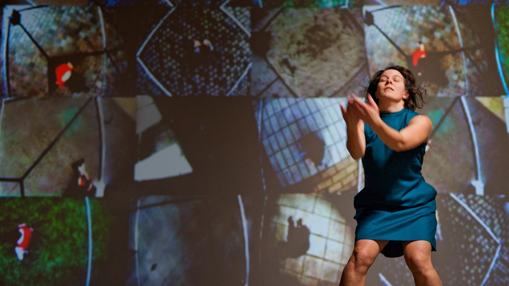 Dans l’espace pur du dehors, au contact des passants, elle utilisait cette structure cubique comme un studio à ciel ouvert : elle explorait son corps en mouvement et provoquait son imaginaire à travers ses rencontres avec le tout-venant. De ce projet d’une durée de 195 heures, intitulé Habiter sa mémoire et présenté dans la salle d’exposition de la Place des Arts jusqu’au 4 janvier 2020, elle est revenue avec des milliers de photographies, chargée d’une expérience qui donne lieu à Intérieurs, une chorégraphie en contrepoint de cette expérience, feedback de ce voyage maintenant gagné par la conscience du retour au présent.