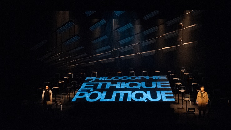 La pièce opte pour une mise en scène un peu attendue. Une plateforme carrée placée de biais forme la classe, au milieu de la scène. Tout s’y passe ; pour le reste, les chaises vides qui saturent l’espace hors de la classe représentent tout à la fois les manifestants qui ne sont pas en cours et la « majorité silencieuse » – sur laquelle on ergote quelques fois – ne pouvant faire entendre sa voix dans le débat philosophique. Des projections sur la plateforme permettent d’évoquer l’actualité à l’extérieur, l’avancée de la grève, ses dérives, ses drames : on sent vite que nous quittons le contexte de 2012 quand une voix de Premier Ministre déplore la mort de certains manifestants ou qu’on parle de l’armée et d’attentats terroristes. Ces projections permettent d’insuffler un certain dynamisme aux échanges, en plus de polir les transitions entre les escarmouches aux allures de leçons qui opposent les deux personnages.