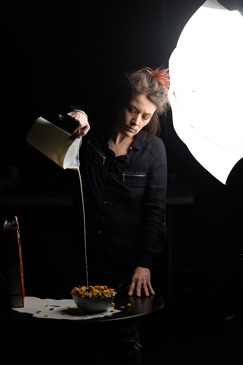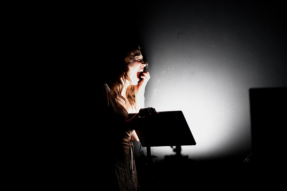 Adossées contre le mur du fond, trois femmes attendent que le spectacle commence. À trois endroits sur la scène, des spots lumineux créent des espaces de jeu restreints pour les comédiennes; côté jardin, une table pliante sur laquelle sont posés les divers accessoires qui serviront (boîte de céréales, sac de lait, nappe, pot de fleurs, etc.) ; côté cour, l’espace de la régie où est posté Pierre-Luc Clément, musicien qui accompagne en direct le spectacle.