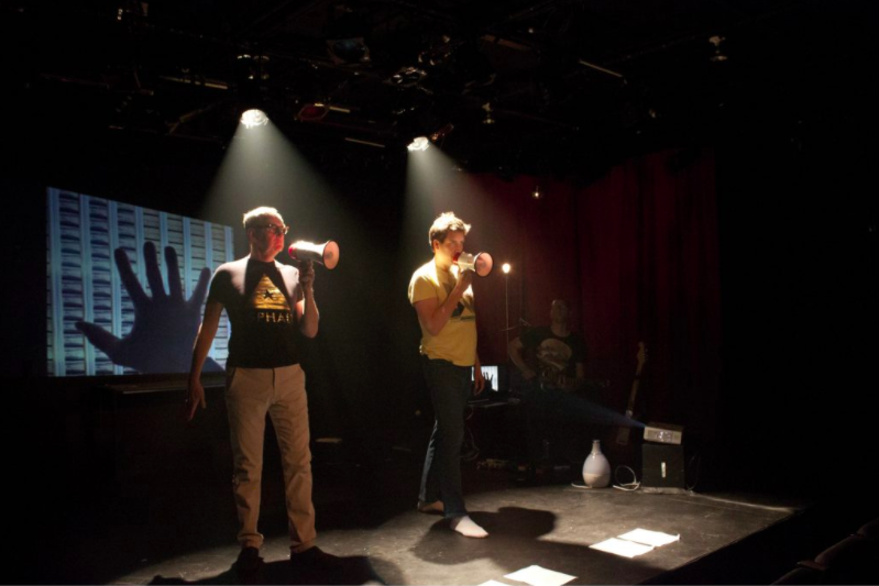 Ces éléments contribuent d’abord à la dimension ludique de la pièce, drôle et divertissante du début à la fin. Dans Je suis mixte, tout tourne au spectacle, ce qui fait que ressort moins l’histoire de François que sa façon de la raconter. Pendant son séjour en Allemagne, François est introduit par son nouvel ami au monde de l’art contemporain et devient – de façon assez improbable – artiste de performance. Cet élément qui pourrait être anecdotique fait ainsi écho au fonctionnement même de la pièce qui, entrecoupée de performances musicales, ressemble elle-même à une longue performance. Le récit de François est dédoublé par des photographies et des vidéos projetés sur un grand écran, sorte de diaporama qui vise probablement surtout à faire rire, mais qui incarne aussi l’idée que nous sommes constamment en train de nous donner en représentation.