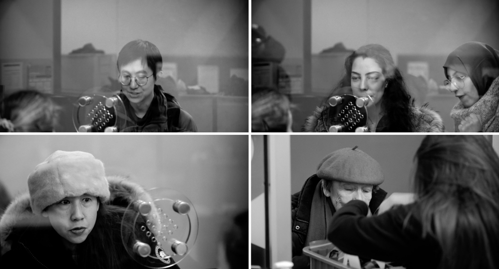 « So I may have lost my passport yesterday, on a 747 bus »… « Avez-vous trouvé une carte OPUS ? »… « Avec la buée, quand on rentre dans le métro… j’ai dû les échapper là »… « I lost my handbag, my wallet, my purse and everything inside »… Nous sommes au comptoir des objets perdus, lieu récurrent qui ponctue le film, carrefour de toutes les histoires. À travers la vitre de sécurité qui nous donne l’impression d’observer la vie d’un aquarium, l’œil de la caméra capte des visages fébriles tandis que des regards pleins d’espoir scrutent l’inventaire des choses dans l’attente de retrouver ce que l’agitation du monde urbain nous fait malencontreusement égarer dans la marée humaine du métro. Or, il est tout sauf anodin que le premier objet perdu mentionné dans le film soit un passeport : d’abord et avant tout, Prière pour une mitaine perdue est un film sur l’identité et, plus encore, sur la tension temporelle entre passé et avenir qui structure notre rapport à nous-même et aux autres. Au-delà des objets, qui ne sont au fond que le prétexte, il y a des vies à surprendre et à raconter. Partant du matériel et du concret – une carte, une tuque, une paire de lunettes, un sac, un cartable –, le film va tirer les fils de cet écheveau d’histoires intimes pour tisser l’histoire d’une de ces communautés de fortunes.