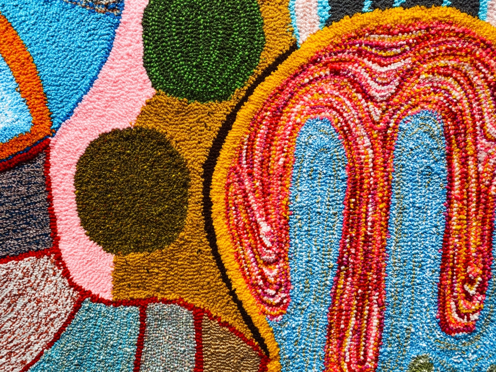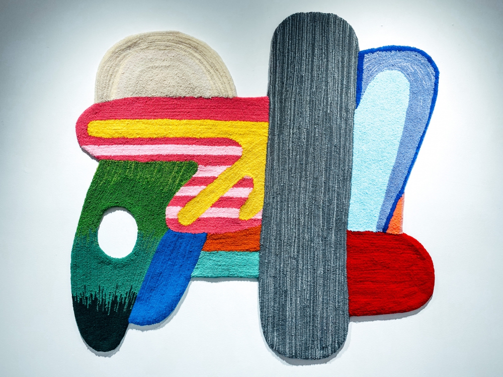 Après ça, je me suis tournée vers les travaux d’aiguille. C’est merveilleux, mais c’est très long comme technique. J’ai cherché une méthode industrielle pour me permettre de continuer à produire des œuvres en grands formats. J’ai écrit à des usines en Chine qui utilisaient un pistolet industriel pour la technique à l’aiguille creuse ou touffetage. Après m’être informée sur le fonctionnement, le voltage et l’importation, j’ai fini par commander cet étrange outil industriel et là, j’ai enfin senti qu’il y avait du potentiel. Je pouvais jouer avec la hauteur, avec la couleur, avec la densité. J’ai travaillé avec plein de nouveaux matériaux et c’était extrêmement nourrissant. Je pouvais enfin me rapprocher d’une picturalité plus contemporaine. Quand j’ai réalisé mes premières pièces, je me suis dit : « Je pense que je l’ai trouvé ». Enfin, j’ai pu me créer un vocabulaire et un langage qui me sont propres au niveau des couleurs et des formes.