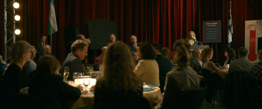 Mais derrière ces belles paroles et ces belles images de résilience se cache une blessure encore plus profonde. Avant même de nous en faire prendre conscience visuellement, Leblanc – qui est une cinéaste dont la poétique est basée sur le détail – nous fait entendre que quelque chose ne tourne pas rond à Sainte-Adeline. Le véritable ton du film est plus subtilement donné : par-dessus l’écran noir du générique d’ouverture, ce que l’on entend d’abord, avant la voix d’Isabelle, ce sont les murmures (ceux des citoyens réunis pour souligner les cinq ans de la tragédie et l’arrivée imminente du parc) et, surtout, un feedback de micro. Aigu et désagréable, ce bruit à la fois subtil et saillant participe pleinement à la direction de spectateur que met en œuvre Leblanc : perçant le voile lisse de cette soirée festive et officielle, ce retour de son a en fait tout d’un retour du refoulé, symptôme de quelque chose d’inavouable et d’inconciliable qui sera tranquillement déplié.
