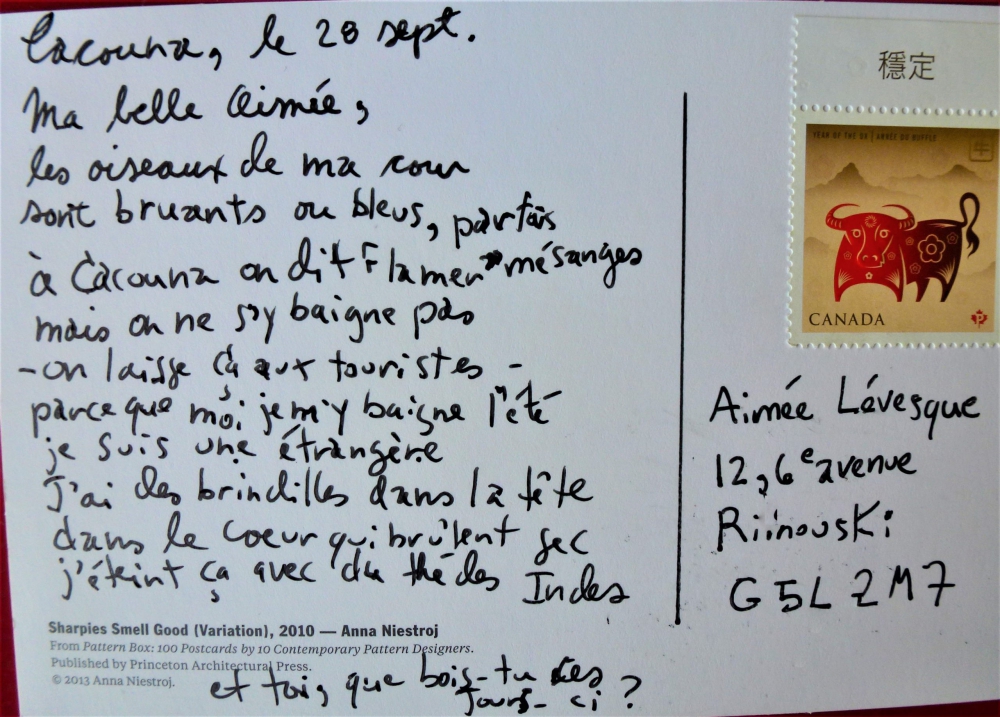 L’espace balados du Mois de la poésie offre une autre œuvre sur fond de paysage d’hiver, épurée, lumineuse et mouvante comme une mer gelée. Ces espaces qui nous traversent réunit trois amis rimouskois dans une correspondance simple et bienveillante. La brièveté des cartes postales et les changements de voix rythment une écoute sans musique. Cela permet à l’oreille de s’immiscer dans un quotidien coincé entre une intimité prosaïque et la vastitude de la nature. On retrouve avec un bonheur nostalgique Geneviève Morin, la poète derrière Gâteaux glacés (édition de la Grenouillère), dont la Capitale s’ennuie déjà : « J’ai quitté le centre-ville de Québec comme on quitte un amant ingrat. À Cacouna, la mer est une belle anesthésiste qui me ferme les yeux. »