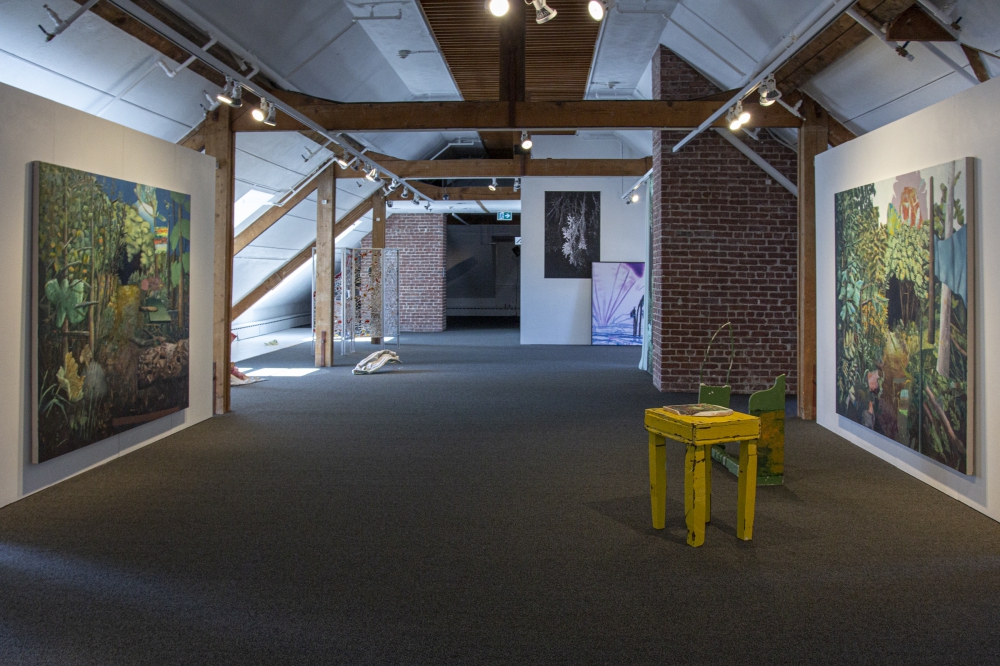 J’avais placé un bureau patiné devant l’un des tableaux [aujourd’hui remplacé par un banc et petit tabouret] et je m’étais raconté l’histoire d’un bureau retrouvé dans la forêt ou plutôt, celle d’une personne qui, ne comprenant pas la forêt, décide de s’y installer pour y travailler. Étant donné qu’on ne peut pas rester éternellement dans une forêt, à cause des intempéries, du climat, cette personne est retournée à sa vie, mais le bureau reste, continue de regarder les lieux. Lui et le tableau sont en situation d’observation mutuelle.