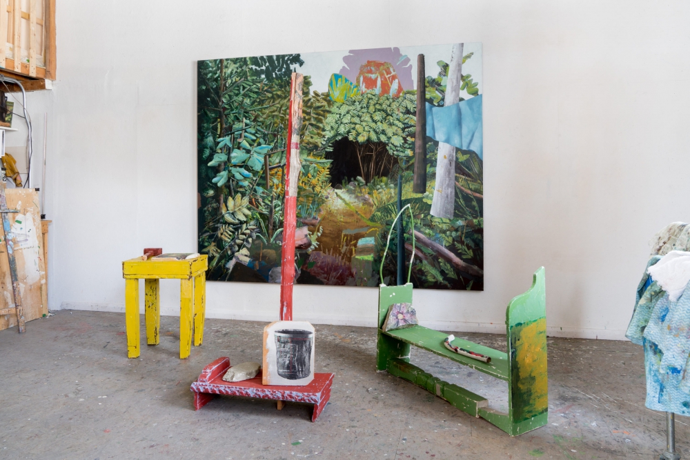 Ensuite, il y a eu le moment du chevalet où je suis sorti à l’extérieur pour peindre sur des moyens formats, et me donner du vocabulaire en ce qui concerne les formes : forme des feuilles, des feuillages, la texture du sol, la terre avec sa lumière et ses cailloux, les fragments de copeaux. Ce qui est devenu difficile dans le jardin, c’est il y avait trop d’éléments : au mois de juillet, ça devenait bordélique, le jardin allait plus vite que le travail que j’étais capable d’y mettre. Ce moment de chaos était frustrant, je n’arrivais pas à me concentrer et c’est à ce moment que j’ai sorti la grenouille [un socle utilisé dans la tradition japonaise de l’ikebana pour accrocher les fleurs].