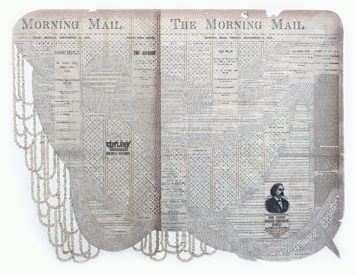 MD : C’est ma façon de travailler : une stratégie de travail par contrastes. Déjà, ma technique est « destructrice », puisque j’utilise un exacto. Je prends une lame et j’enlève du matériau. Je coupe dans le papier, je le fragilise. C’est quand même un geste de coupure, mais qui donne naissance à quelque chose de super beau, de délicat. Ensuite, il y a un contraste, comme tu l’as dit, entre le sujet et les qualités ornementales, décoratives. C’est simultanément une stratégie de séduction et de répulsion. Qu’est-ce qui se passe ? Pourquoi, tout à coup, je ne suis plus sûre de trouver ça si attrayant? Il y a évidemment un dernier contraste entre la quantité de temps et de labeur investi dans un médium aussi banal et pauvre de qualité que le papier journal. Je pense que c’est grâce à cette tension-là que ça marche et que ça déclenche des questionnements.