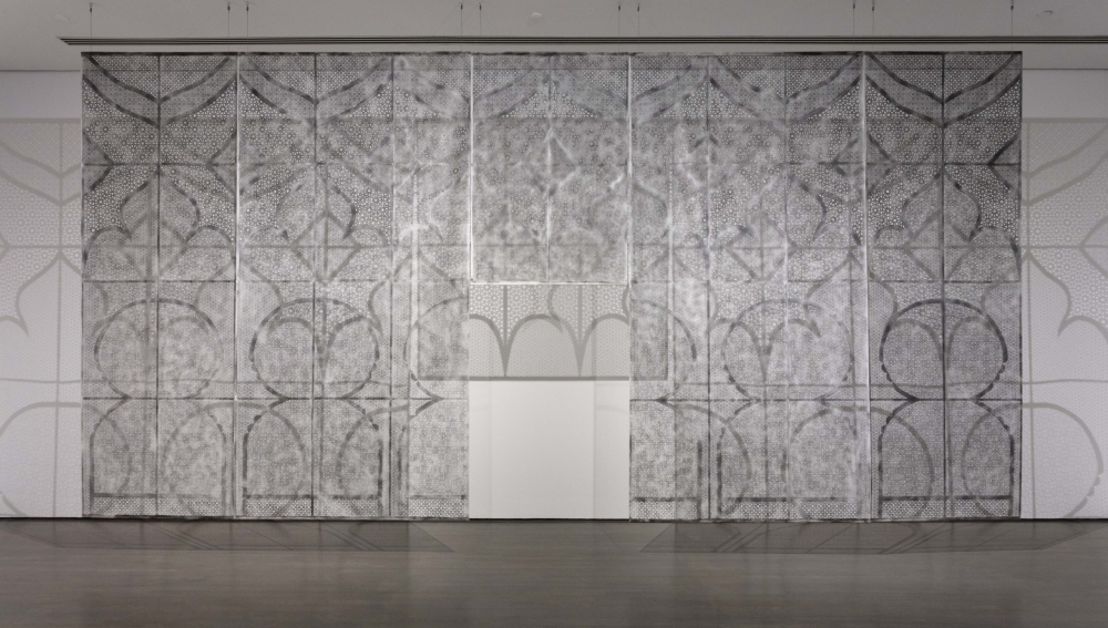 La première fois que j’ai exposé Façade de recueillement, c’était à L’Œil de poisson, à Québec. J’ai réalisé l’œuvre en fonction des dimensions de la salle et je l’ai collée au mur pour l’utiliser comme un pochoir. Dessus, j’avais mis du graphite avec un pinceau avant de la détacher du mur. Ça a permis d’avoir une copie de l’œuvre au fond de la salle, puis l’original suspendu au milieu, et enfin, les motifs projetés en ombrages. Le résultat était une pièce remplie de motifs, c’était extrêmement immersif.
