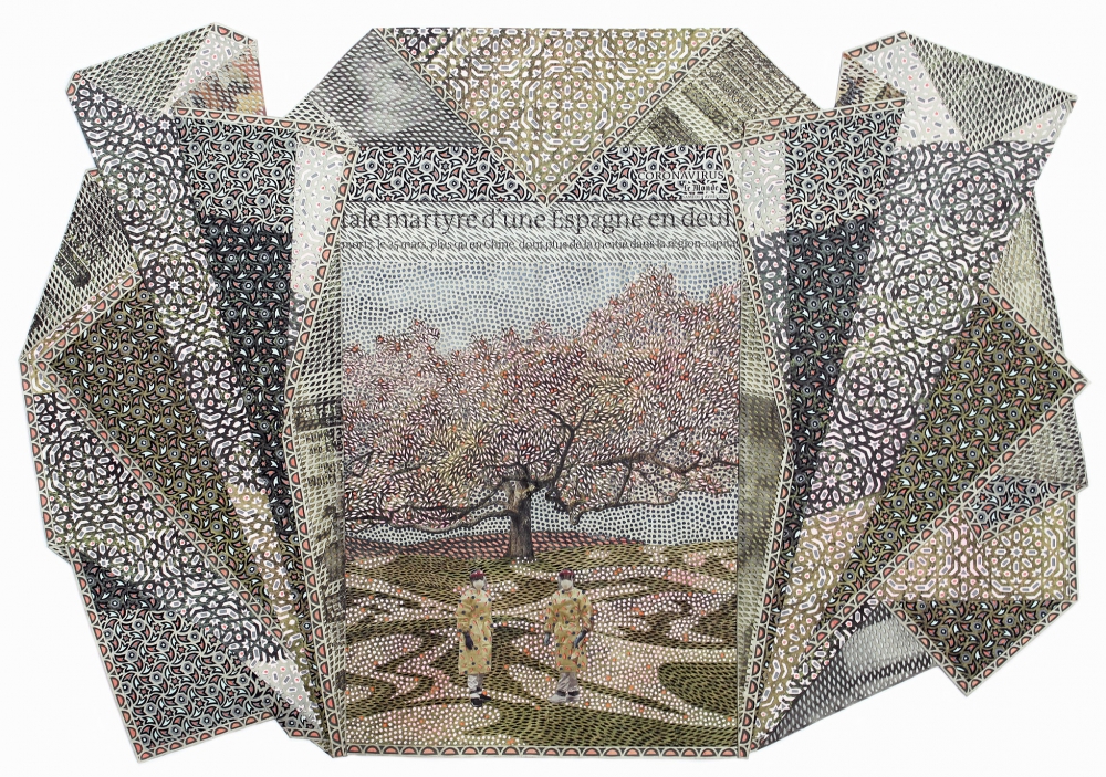 MD : Je choisis les journaux et les articles, donc ils sont forcément basés sur mes intérêts, ce qui me touche et ce que je trouve marquant. Je faisais mon site web il y a deux semaines et, en regardant les œuvres classées par année, j’ai réalisé que je peux vraiment associer chaque œuvre à une période de ma vie. Je me disais : « Tiens, ça, c’est pendant que j’écoutais beaucoup Radiohead » ou « Ça, c’est quand j’écoutais tel podcast, tel documentaire ». J’ai eu une période où j’écoutais vraiment beaucoup de livres audio de Stephen King. Je me dis que ce que je fais pendant que je travaille, ça doit forcément m’influencer.