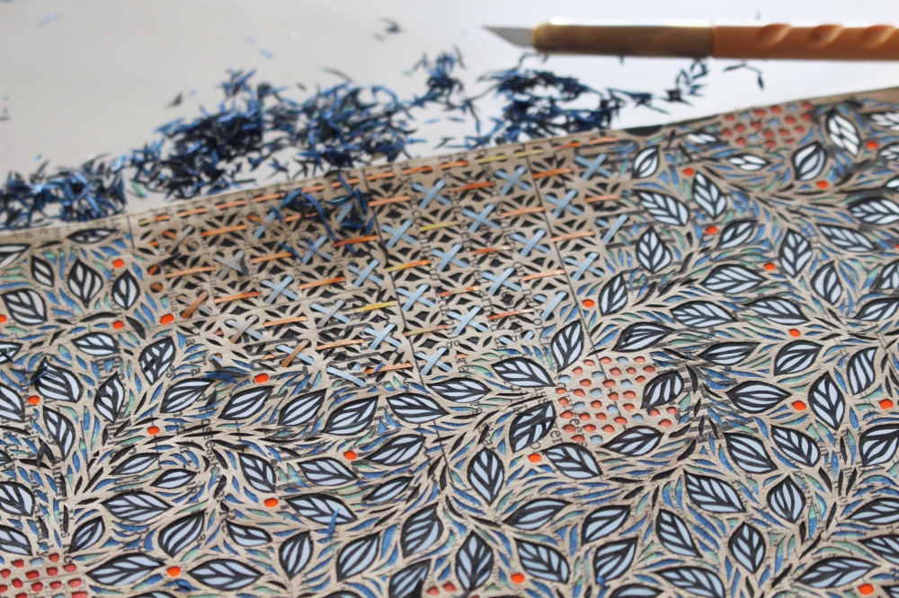 Contrairement à ce que l’on pense, ce n’est pas plus long de faire une installation de grand format. Les motifs sont plus gros, moins détaillés puisqu’on les perd dans la hauteur. J’aime quand les détails sont à la hauteur des yeux, c’est pourquoi j’en mets davantage dans les œuvres de plus petit format. En termes d’heures de travail, c’est relativement la même chose, mais ce qui va changer, c’est la destination de l’œuvre et sa visibilité. Les grandes installations sont souvent des formats plus muséaux, voire des commandes pour un lieu en particulier.
