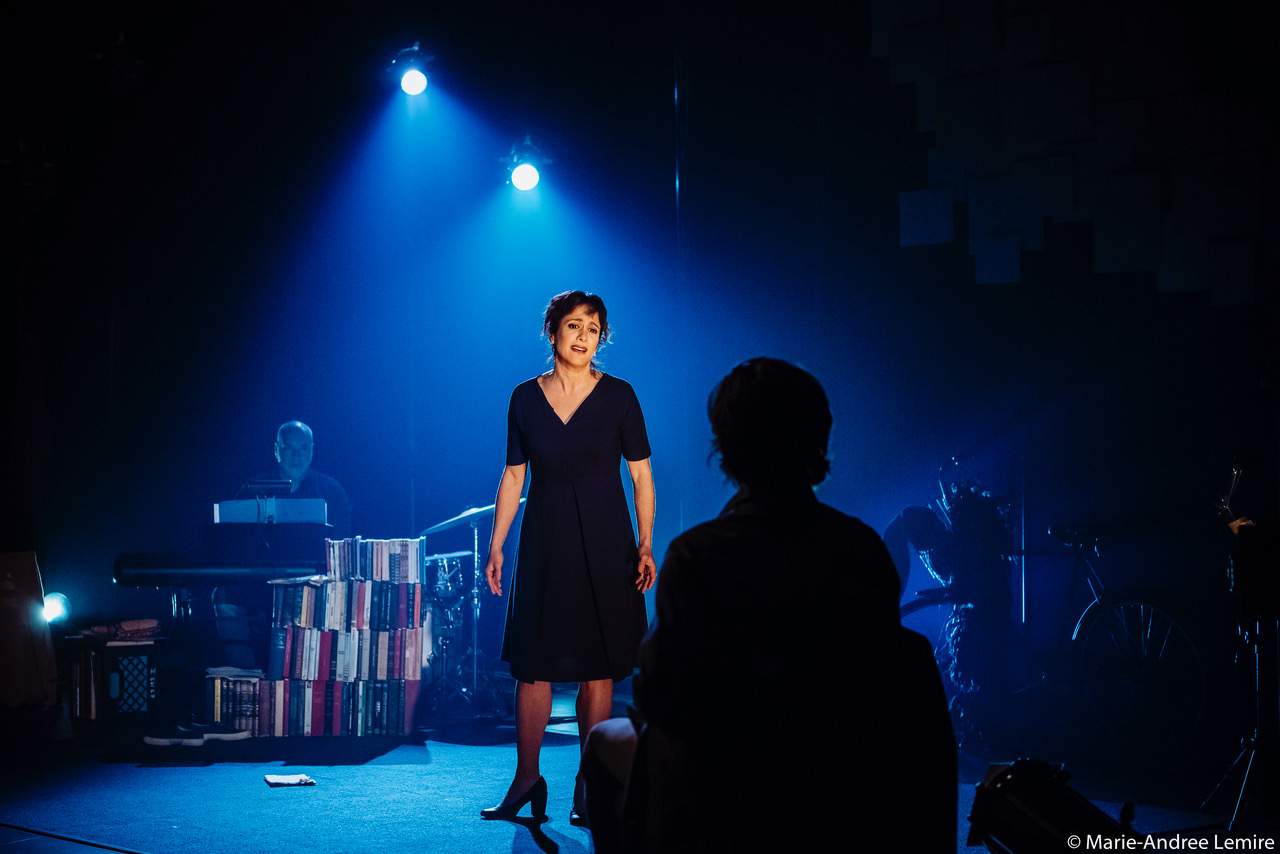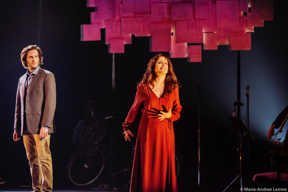 La mise en scène que propose Benoît Vermeulen est toute simple, ce qui ne l’empêche pas d’être d’une grande efficacité. Le rythme avec lequel s’enchaînent les tableaux, ponctués ici et là de chansons de Pauline Julien ou de poèmes de Gérald Godin, est fluide. La scénographie de Nathalie Trépanier – des piles de livre, une bicyclette, une coiffeuse, des chaises, un micro, un écran de projection – nous plonge rapidement dans l’univers de ces deux artistes en laissant toute la place aux interprètes et aux univers poétiques qu’ils incarnent. Le tout est accompagné par la musique de Gaël Lane Lépine, laquelle permet de lier de belle façon la disparité des époques et des espaces évoqués. Évitant les enrobages superflus, tout est mis en œuvre afin que les mots de Julien et de Godin soient célébrés.