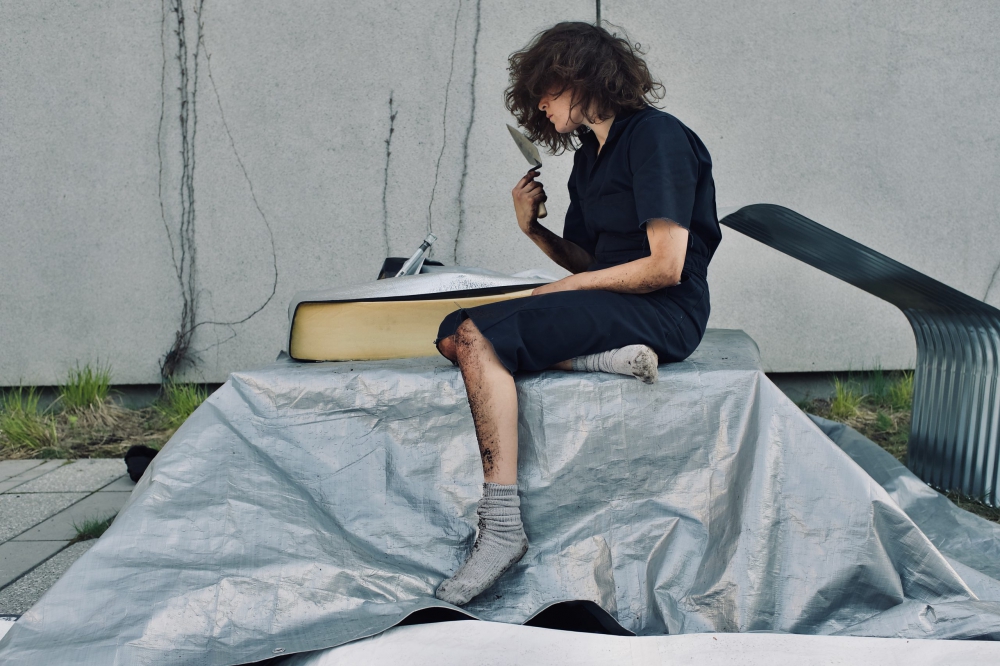 Kramer, allongée sous des oripeaux mal ajustés et des bâches de chantier, gît sur un monticule qui domine une longue bande de terre noire, recouverte d’un plastique blanc figurant une banquise ou la neige soulevée par le vent. Dans cette zone à l’abandon, elle invite le public à attendre longuement qu’elle ne bouge, à méditer durant sa léthargie dans l’espace sonore, monotone, méditatif. L’effet est assez puissant : le synthétiseur, cédant son espace musical aux bruits urbains et aux accents tempétueux du soir, agrandit l’espace du jeu pour intégrer les conditions réelles des chocs sur un corps qui vit dehors.