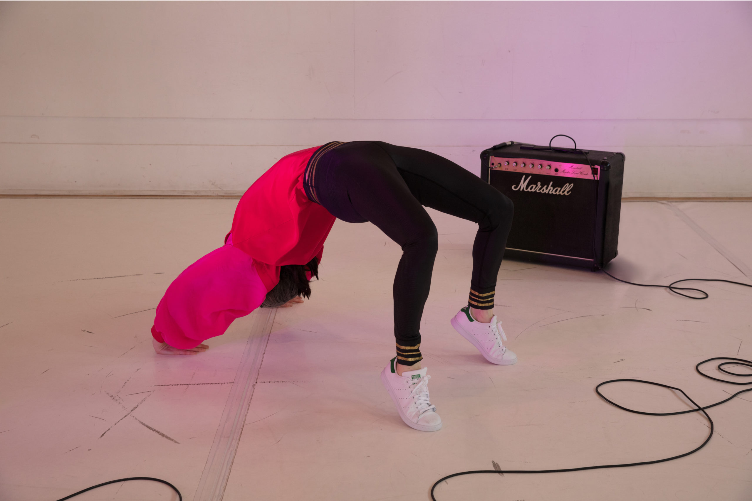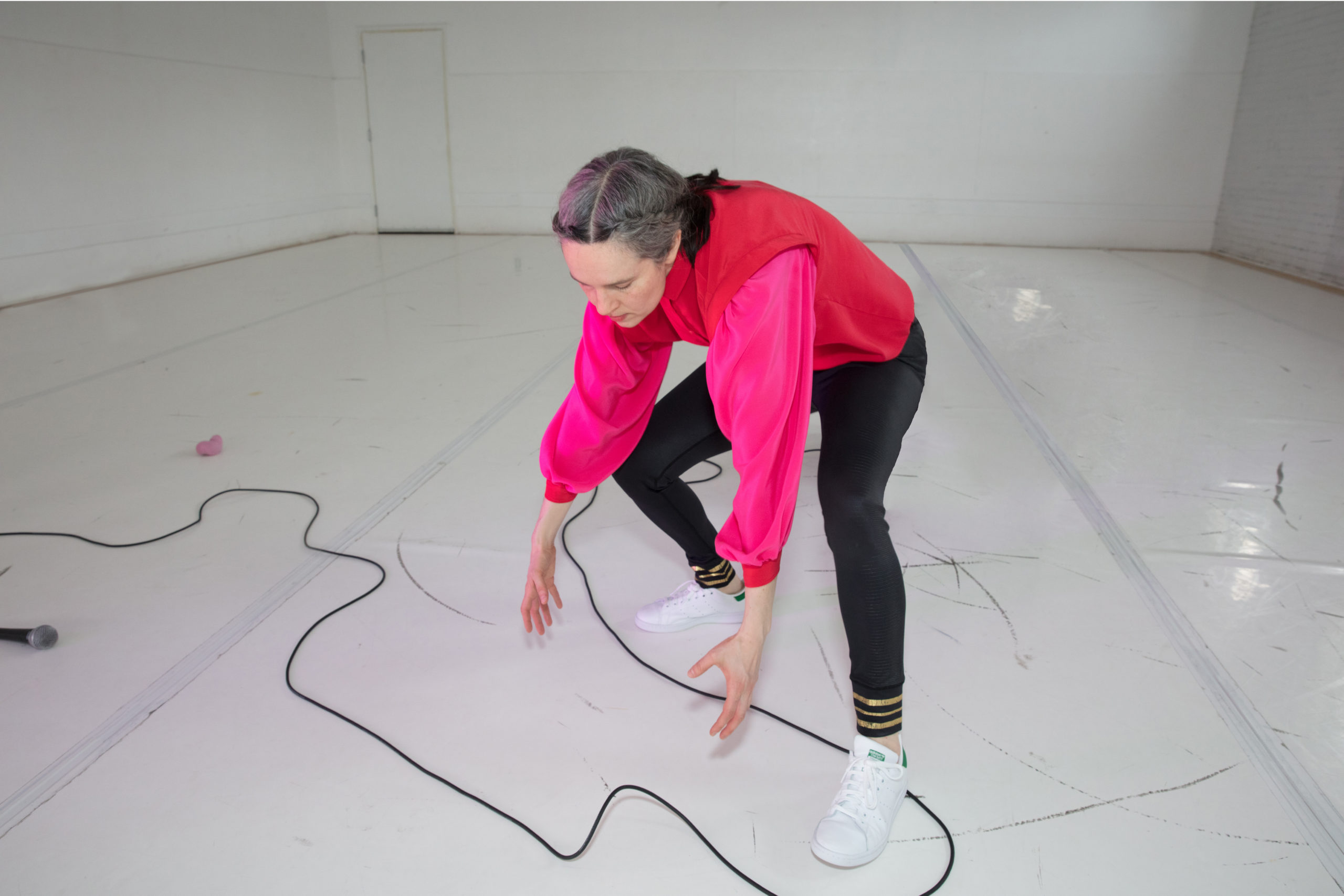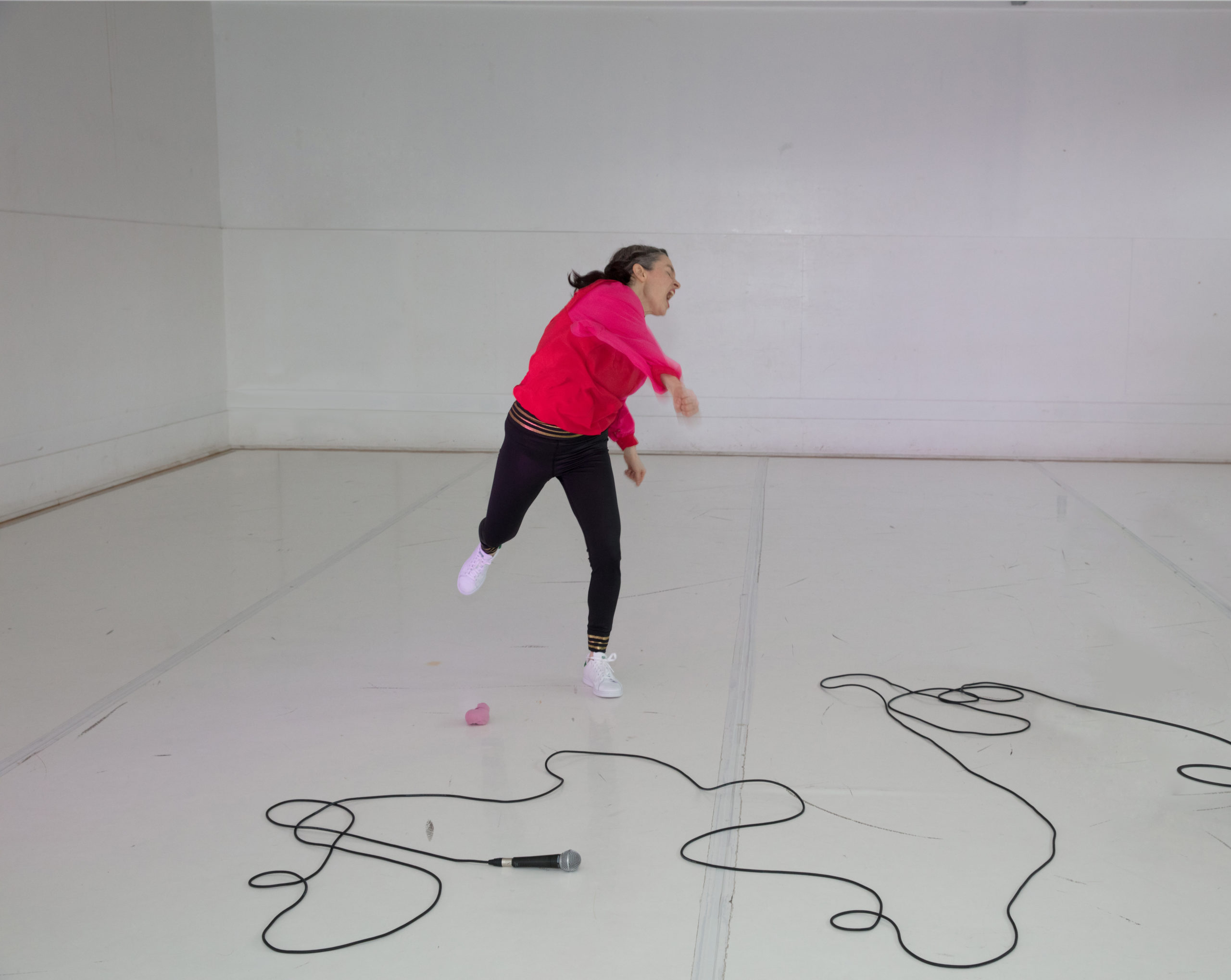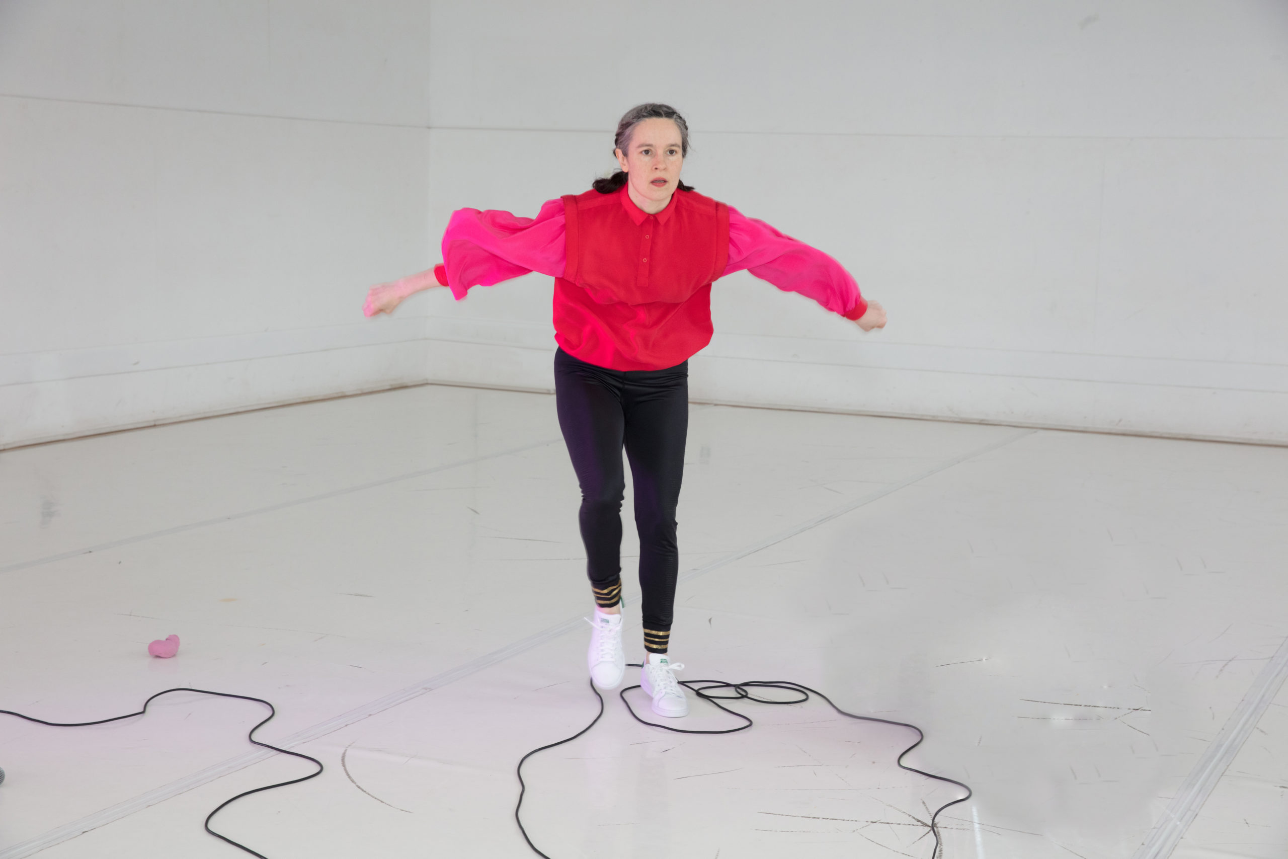 Dès notre entrée dans la salle, la créatrice du spectacle, accompagnée par la perchiste (Camille Gravel), profitent de l’intimité de la salle du théâtre La Chapelle pour accueillir un par un la quinzaine de spectateurs. On nous dispose alors autour de la scène, dans une grande proximité avec l’interprète. D’entrée de jeu, on remarque la sobriété de la scénographie : la scène est un carré blanc éclairé par une lumière neutre (un « éclairage de sécurité », pourrait-on dire), sans musique. Un micro, une caisse de son et un petit objet (qui semble être une paire de bas) sont visibles sur la scène. Cette absence de décor insiste sur l’idée que tout reste à faire, à improviser et que rien, ni même la scénographie, n’est encore créée. Dans cet espace blanc, dénudé, l’œil est attiré par le costume bouffant, coloré rouge et rose, de Katie Ward.