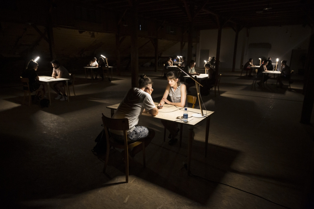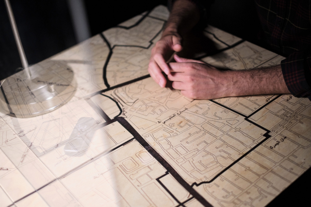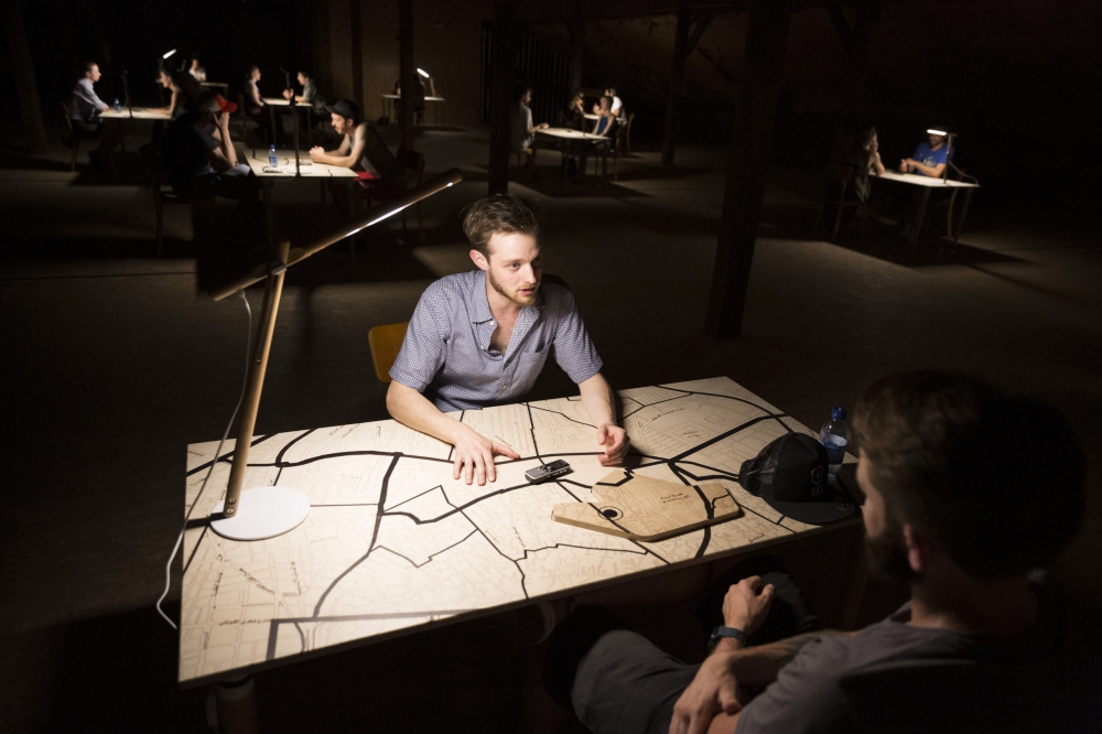 Sur la carte, les spectateurs choisissent tour à tour une pièce de bois amovible qui correspond à un quartier spécifique. Apparaît dès lors le caractère profondément lacunaire de l’expérience offerte puisque ce fragment de la ville permet au participant d’identifier, dans le studio de danse, une table au centre de laquelle, à la manière d’un jeu pour enfant, il peut insérer son morceau de bois. Ce moment, bien qu’artificiel et forcé, permet une entrée en matière sous la forme d’une déambulation semi active. Une voix explique le processus créatif de la pièce, qui a consisté en une récolte de témoignages d’anciens habitants d’Alep à propos des lieux qu’ils ont laissés derrière eux en quittant la ville. Simultanément, les spectateurs masqués tâtonnent du regard et sillonnent les lieux dans un jeu de chaises musicales où plane un doute, aussi excitant qu’inquiétant : « quel récit m’attend à la table que j’ai choisie ? ». Après cette introduction méditative, le reste de l’expérience consiste en un face à face de vingt minutes avec l’un des dix témoignages. Dans le brouhaha troublant des performances qui se superposent, le dispositif permet de mettre en évidence la multiplicité des histoires tout en conservant l’attention sur une seule d’entre elles. Grace à un magnétophone distribué à l’entrée, un extrait du témoignage est présenté puis, rapidement, les mots en arabes sont remplacés par l’anglais ou le français (le spectacle est présenté dans les deux langues), du comédien.