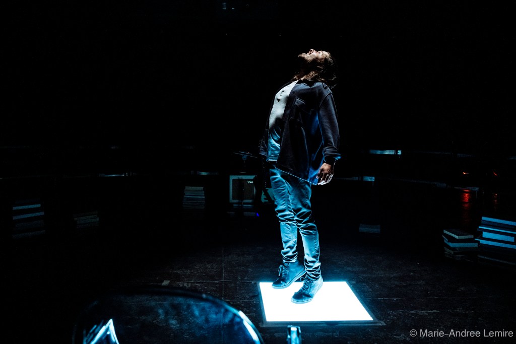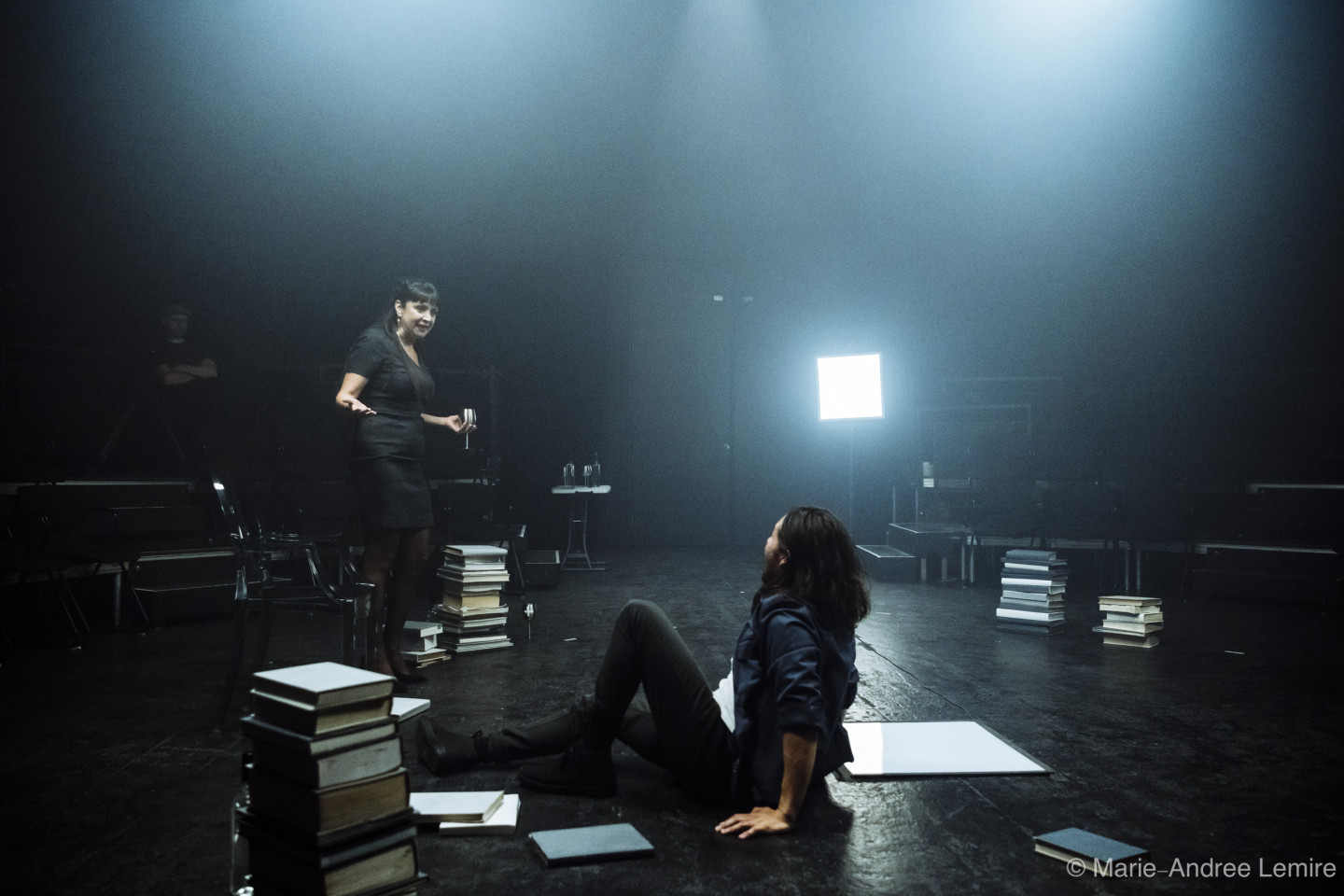 Le décor se limite à des livres s’empilant de façon bancale jusqu’au plafond et dispersés au sol, tandis qu’une guitare électrique ajoute une dimension qui dépasse la réalité du souper. De larges carrés lumineux suspendus au plafond forment un cercle, et leur jeu de lumière s’ajoute à la présence d’un mystérieux carré au sol qui s’illumine à quelques reprises pour rythmer les échanges et les révélations. Comme pour les pièces précédentes des Productions Menuentakuan, le public est disposé en cercle autour des comédien.ne.s, ce qui crée un effet d’hyperproximité ajoutant au sentiment suffocant du souper, où les invité.e.s et les hôtes sont prisonnier.ière.s de cet espace – un parallèle, sans doute, avec le caractère inflexible de leurs idées. Je suis assis.e dans la première rangée du cercle, et la proximité avec les comédien.ne.s, qui se positionnent parfois vers le public et d’autres fois lui tournent le dos, diffuse le malaise et les rires dans mon propre corps tout en me permettant de scruter les réactions des autres spectateur.rice.s. En ressort le sentiment d’être entraîné.e.s collectivement dans cette tragicomédie qu’est la vie dans un contexte de colonisation d’établissement.
