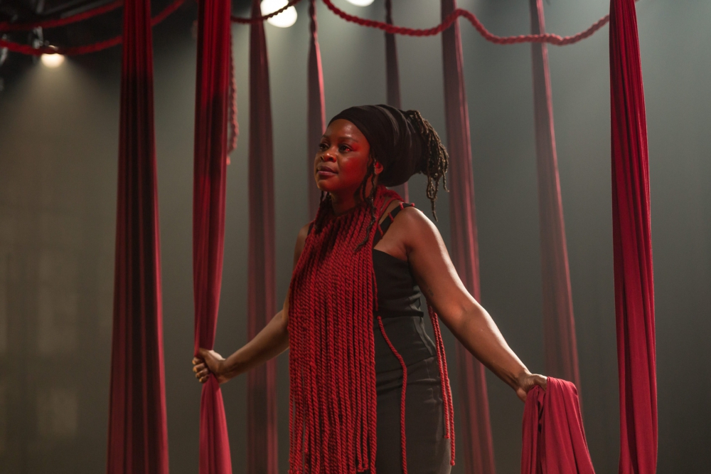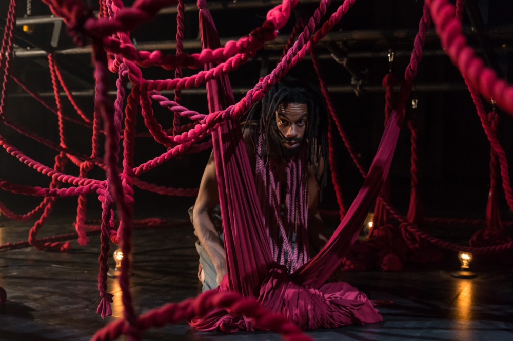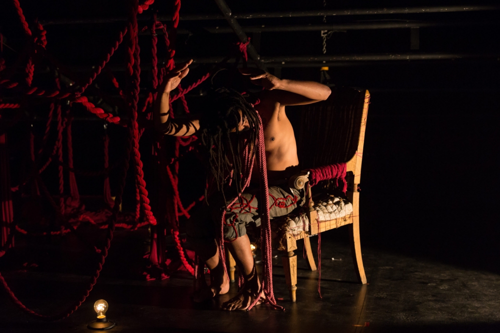 Le jeu de Philippe Racine, qui est seul sur scène le soir où nous assistons au spectacle, est précis : le comédien d’origine haïtienne jongle habilement avec la voix d’Antigone, fragile et assurée, celle de Créon, arrogante et surplombante, puis de Tirésias, sage et créole (un choix d’accent à interroger, soit dit au passage, puisqu’il frôle l’auto-essentialisme, même si la démarche d’appropriation devrait l’expliquer). Maîtrisé, le jeu convainc : les voix ainsi posées, en harmonie avec la gestuelle du corps, font habilement passer le comédien d’une incarnation à l’autre. La scène est toute tendue de cordes et de rubans rouges, un décor d’une symbolique efficace quoiqu’évidente, qui semble piéger Antigone dans les filets de sa destinée, particulièrement lorsqu’elle s’accroche à ces nouages, s’y fraie un chemin, rampe dessous. Le plafond, bas comme celui d’une caverne, accentue l’impression d’écrasement qui confère d’emblée au corps d’Antigone une allure démantibulée. Ses gestes, lents et saccadés, invoquent l’organicité malgré un trop-plein d’esthétisme. Le rythme est hachuré, et l’atmosphère, entre sentiment de pression et lumières tamisées, est suffocante : Antigone est déjà une ombre, prise en tenaille entre la loi divine et la loi des hommes. Les extraits de l’Antigone haïtienne de Félix Morisseau-Leroy, qui résonnent entre les tableaux, ouvrent des perspectives vers l’île martyre dont Racine est originaire, et autour de laquelle est centrée la proposition de Dantiste (notamment par le biais de la question du vaudou, qui actualise le mythe dans la réalité d’un pays infusé de sacré). Ces échappées sonores offrent un certain souffle à la performance, dont la grande réussite reste celle de l’effacement du genre : au bout de quelques minutes, l’on oublie que, sous nos yeux, Antigone a un corps d’homme. Preuve s’il en est que tout est question de biais (ce qui fait d’ailleurs écho à la proposition anti-œdipienne faite par Judith Butler dans Antigone’s Claim (2002), où cette figure jette un trouble dans la génération (en s’élevant contre l’ordre établi, la loi patriarcale) et dans le genre.