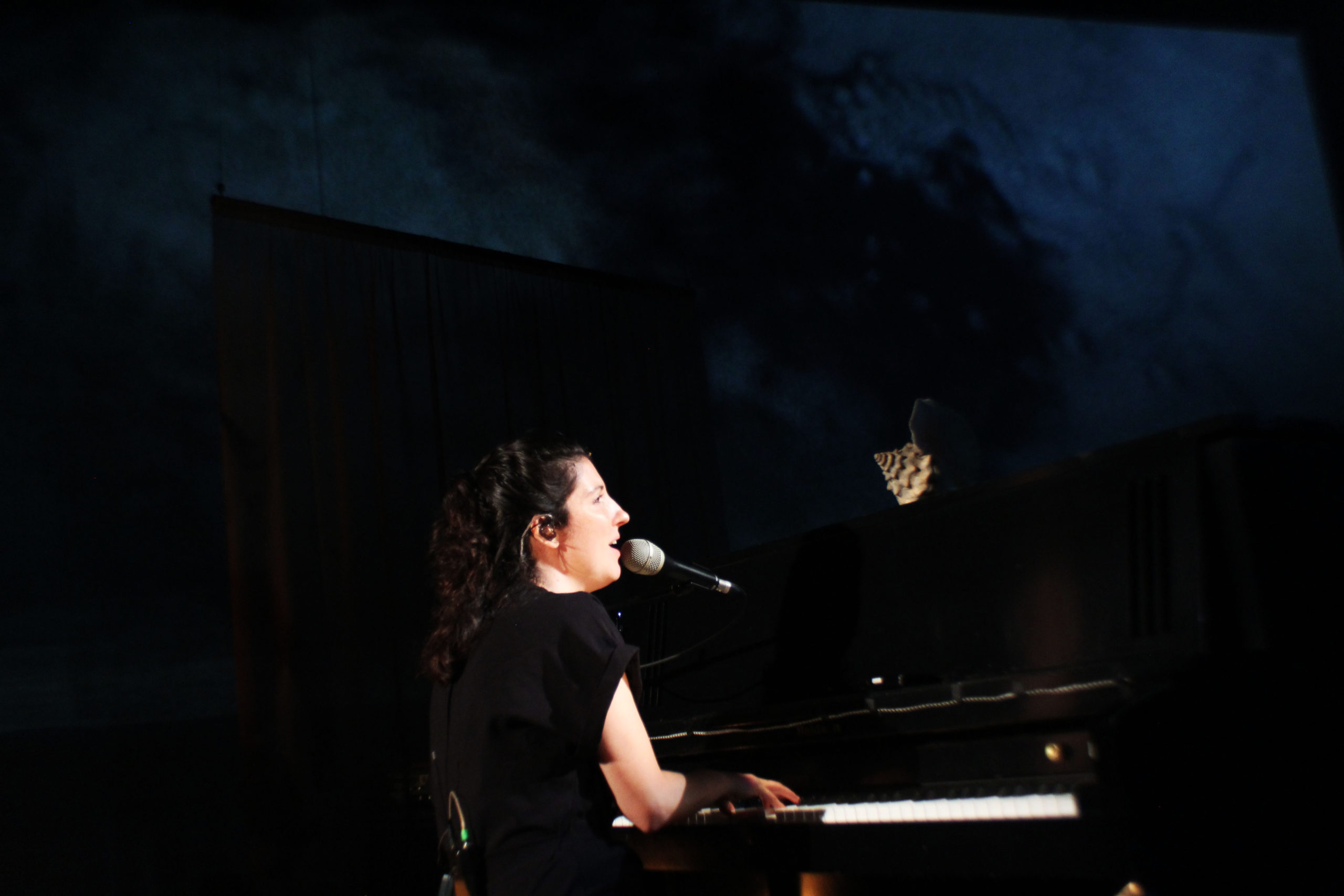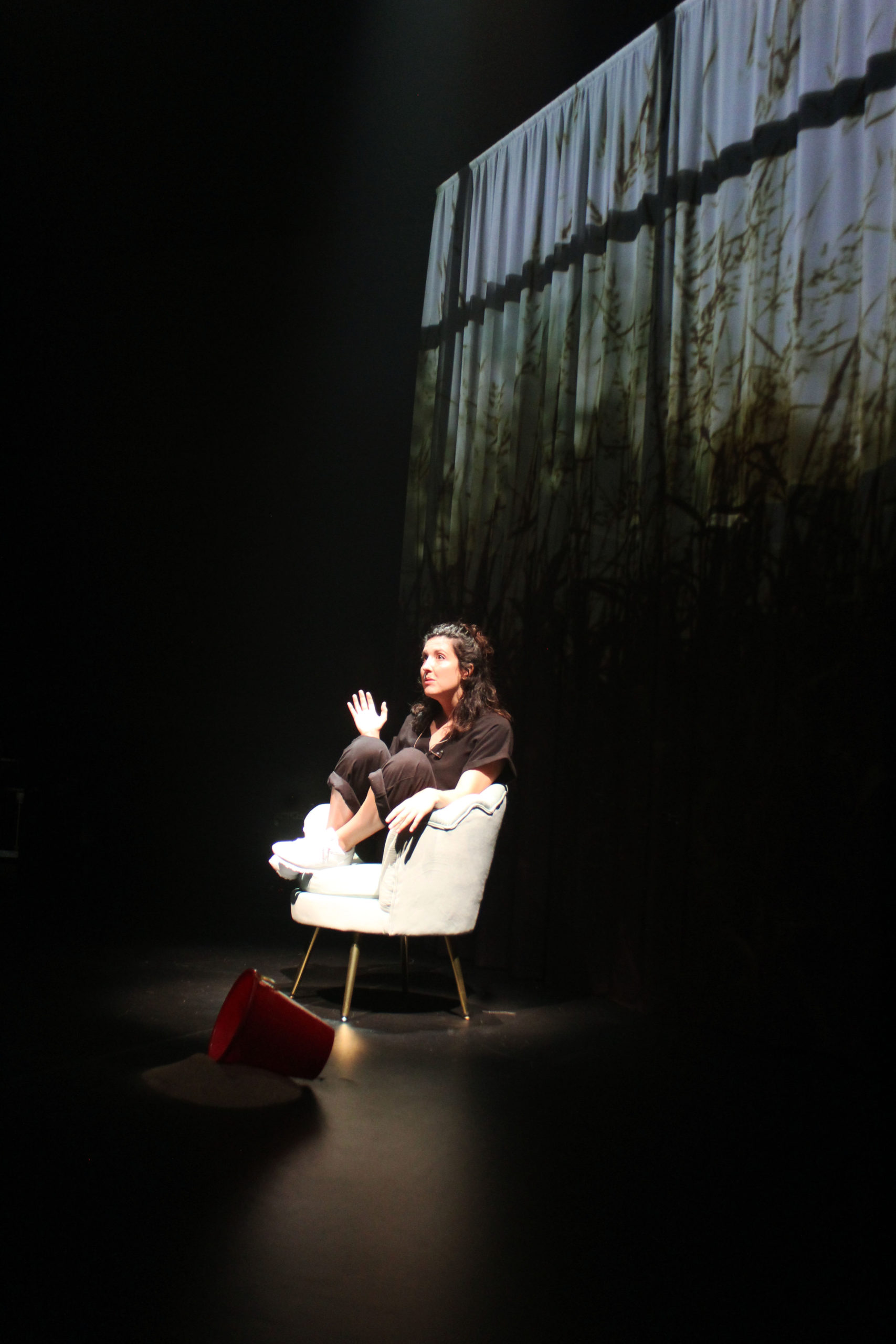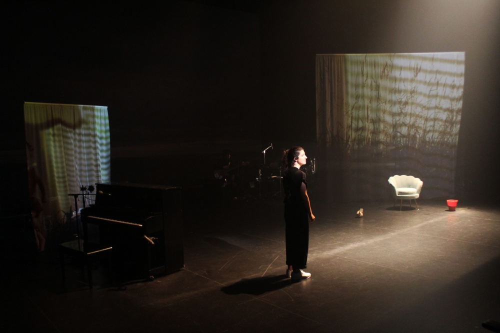 C’est ainsi que Chloé Lacasse décrit la genèse de l’œuvre hybride que deviendra Les eaux claires, récit de souvenirs et d’images retrouvées. La scénographie magnifique annonce dès le départ ce dont nous serons spectateur·rice·s : la scène de la parole au centre est encadrée par un piano à l’avant-scène gauche. À côté de celui-ci, un écran vaporeux qu’on pourrait prendre pour une fenêtre sur l’extérieur, dont les rideaux tremblent légèrement dans la brise d’été. Derrière, en fond de scène, sous un grand écran, trois musiciens (Guillaume Bourque, Vincent Carré et Marc-André Landry) dont on ne tente pas de camoufler la présence, car ils font partie de cette représentation à part entière. Sur le côté droit de la scène, le même écran-fenêtre, seulement un peu plus grand, et devant, une chaise de salon. On se trouve chez l’autrice-compositrice-interprète, et son récit sera parfois narré, parfois chanté, mais toujours accompagné de photos et de vidéos venant à la fois de cette enfance qui reflue et du travail de la photographe et cinéaste Sarah Seené.