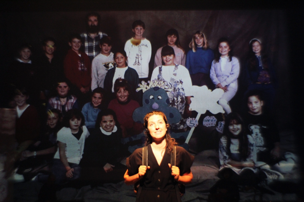 J’ai évoqué un récit de souvenirs et d’images retrouvées mais, derrière ceux-ci, c’est davantage celui du deuil de la mère qui est fait. Son point de départ est le diagnostic d’un cancer incurable et le décès inévitable son point d’arrivée. Entre les deux, Lacasse traverse la scène comme elle a dû traverser la maison familiale léguée, retrouvant par fragments menus objets, réminiscences et émotions enfouies. Mémoire des petits moments, que l’absence rend plus significatifs que ceux immortalisés par la photo. On alterne donc entre les deux : les souvenirs de la petite Chloé grandissant dans cette maison de Longueuil, appuyés par des images attendrissantes d’archives familiales, mènent inévitablement à l’évocation de la mère, dont l’écho semble avoir été capturé, par-delà l’absence, dans le vide cette maison – comme on dit pouvoir entendre l’écho de la mer dans ces grands coquillages, dont un, immense, trône sur une scène autrement dénudée.