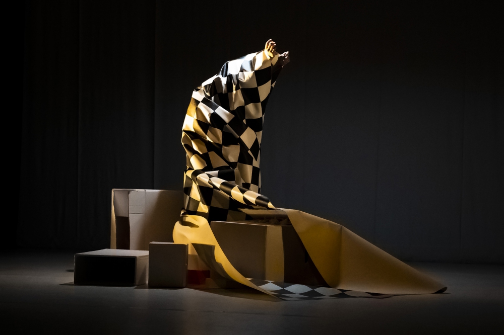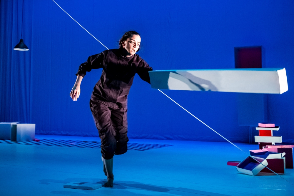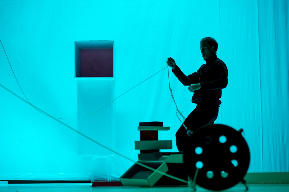 La naissance des corps est marquée par une transition brutale de l’éclairage. La scène s’illumine entièrement : apparaissent alors d’autres boîtes disposées en ordre de grandeur, un plancher en damier, des objets de formes carrée ou rectangulaire. C’est la froideur de la composition scénographique qui frappe d’emblée. Dans ce tableau expressionniste, il n’y a aucune courbe, aucun cercle, aucune rondeur; tout est carré, pointu, anguleux. Les costumes des interprètes (Julia B. Laperrière, Sébastien Provencher), comme les objets disposés sur la scène, sont noirs et blancs. Du tout émerge un monde carré, rigide, sans couleurs, sans nuances de gris – un monde où il n’y a rien d’indécidable, où il n’y a pas de fluidité.