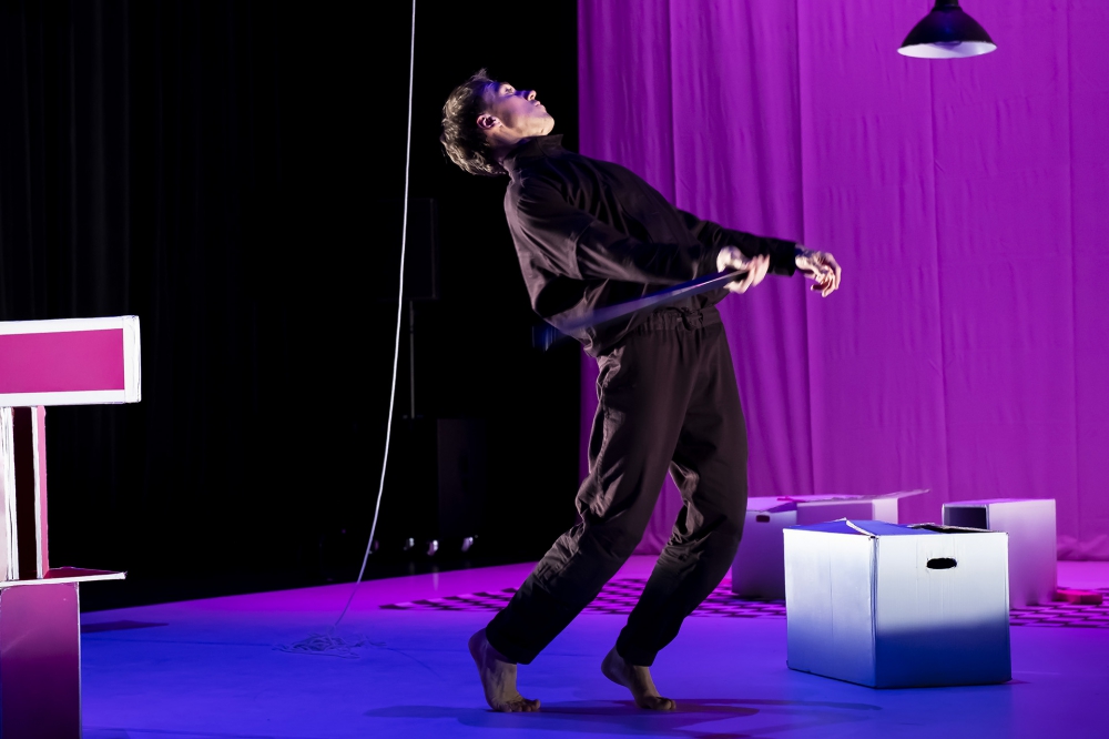 De nouveaux objets apparaissent également sur la scène, alors qu’on ouvre les boîtes, dans lesquelles se trouvent des petites balles de mousse colorées. Le décor prend aussitôt une dimension plus ludique, festive, impression accentuée par l’éclairage qui se réchauffe progressivement, passant du bleu au rose, du rouge au mauve. Il faut souligner la qualité visuelle du spectacle, puisque la force de la production se situe en effet au niveau de la scénographie, qui produit un dialogue entre les interprètes et le monde physique se transformant autour d’eux. C’est d’ailleurs un des moteurs de création de Julia B. Laperrière, qui est intéressée depuis longtemps par la relation entre les pratiques de la danse et de l’installation.