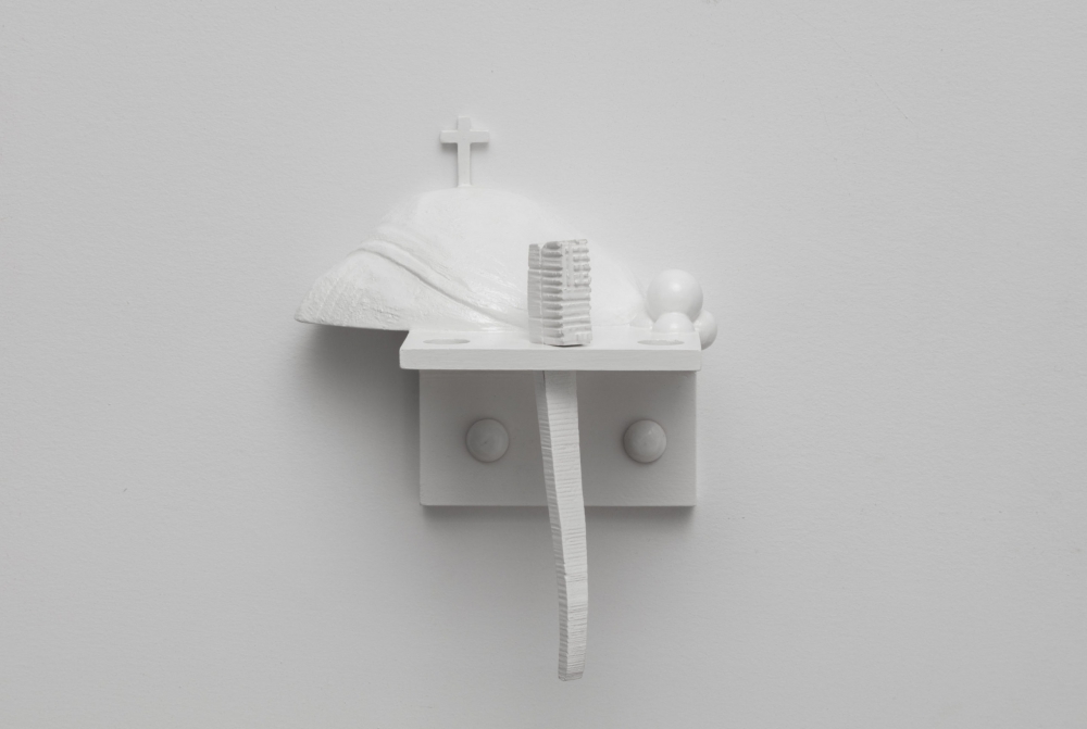 À la mezzanine, tout se passe comme si la sculpture (telle que l’artiste la désigne, en tant que force un peu souterraine dotée de pouvoir d’agir) avait avalé les icones du quotidien (berlingot de lait, patin, figurine de bois, tuyau, fioles, cul de bouteille, visage christique, etc.) pour les expulser reconfigurées. Elles sont tantôt liées par des nuages de matière informe, tantôt simplement soudées les unes aux autre autres en une syntagmatique inchoative, à la recherche de ses propres inventions. Si le principe d’association iconique se poursuit dans cette section de l’exposition, il est remarquable de voir à quel point le bois s’y fait oublier, ainsi blanchi et colorisé, un peu comme si on le traitait à la manière d’une forme à façonner. Or, le hiatus entre la surface sur laquelle insiste l’apposition de couleurs et le matériau de base génère une facticité joueuse et trompeuse : les objets s’affichent ouvertement produits, mais cachent en même temps leur origine ; ils exhibent le souvenir d’images tout en les ré-agençant avec exubérance et en moquant, par extraction, leur contexte usuel. Les motifs anthropomorphes — tête soigneusement divisée en ses axes sur laquelle repose une sphère couverte de petits cratères, visages amalgamés aux compositions, verticalité et rondeur du corps ou évocation fantomatique du motif de l’éphèbe —poursuivent et approfondissent ce décalage, flottant entre et absence et présence, entre réalité tangible et imaginaire futuriste.