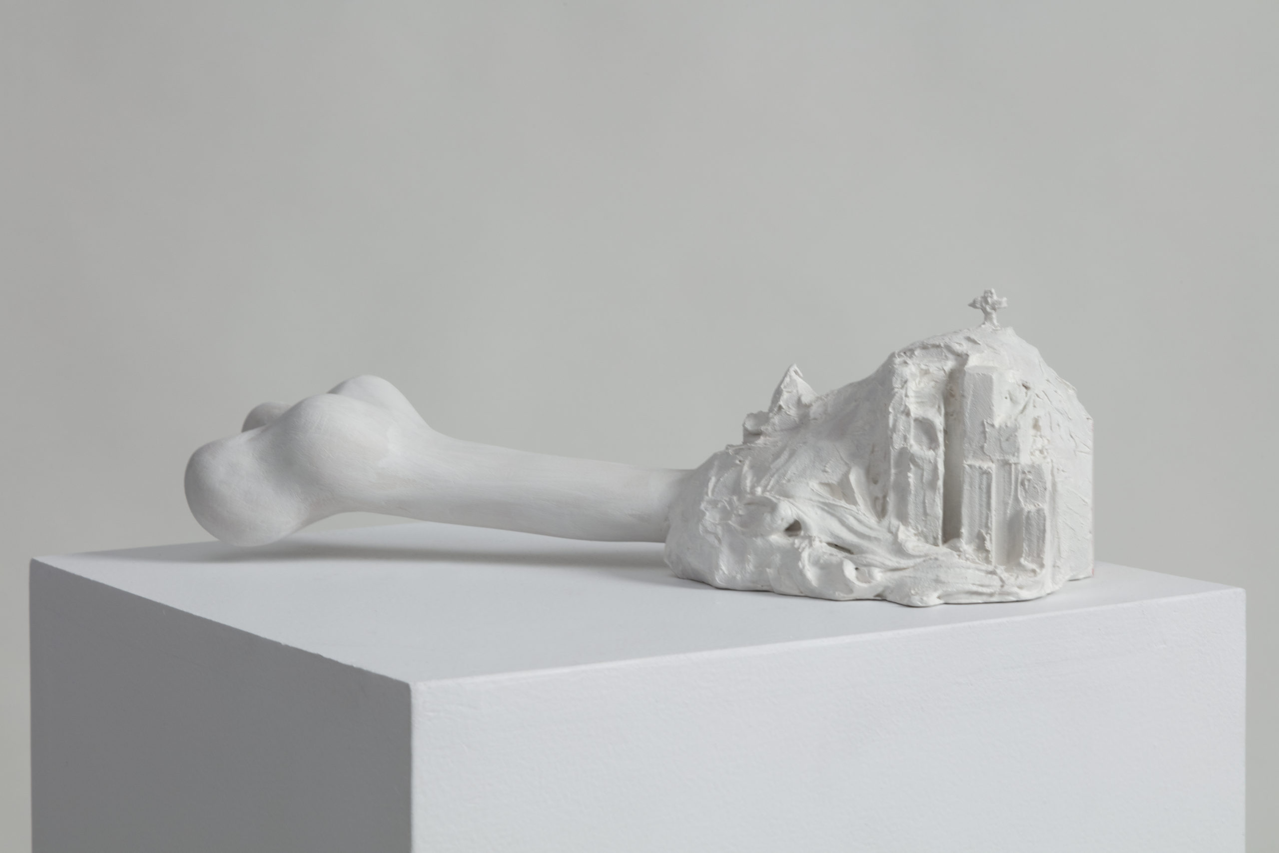 qu’objectaux, à l’exception de la recréation d’atelier, aménagée dans le coffre-fort de l’ancien bureau de poste. Au rez-de-chaussée sont montrées les œuvres les plus monumentales – les grandes constructions de bois que sont Trou de ver (2009), Autoportrait de Dieu (1998) et L’homme (2017-2020) – et des pièces de moyenne dimension résonnant avec les procédures, matériaux et motifs présents dans les grandes compositions. Le bois, matière de prédilection de l’artiste, y apparaît comme indexé à l’ameublement en d’immenses amalgames de morceaux tronqués, ensembles à la fois savants et chaotiques où se nichent tantôt un buste, tantôt un grand corps à la renverse ou des motifs à découvrir entre ces branchages au symbolisme tranché. Ailleurs, le bois se tapit derrière le volume d’un drapé canonique auquel se greffent des motifs « vulgaires » (revolver, abreuvoir). Ceux-ci précisent l’invitation à traverser l’objet pour qui a la curiosité de suivre les trouées subtiles au bout desquelles quelques surprises attendent d’être découvertes. La tension entre extériorité et intériorité se fait aussi patente dans Tête d’enfant (2013) et L’homme, où les parois quadripartites laissent place à des jours à partir desquels regarder des profils de visage inversé ou des cariatides intériorisées de bonhommes de neige. Statue (2013) met en évidence le travail de la multifacialité de la sculpture à travers les changements de points de vue dramatiques que ses axes révèlent. On oscille entre aperçu de face d’une figure de carnaval, profil archi-ténu de la même figure, volumétrie sensuelle évoquant le façonnage des formes en son dos.