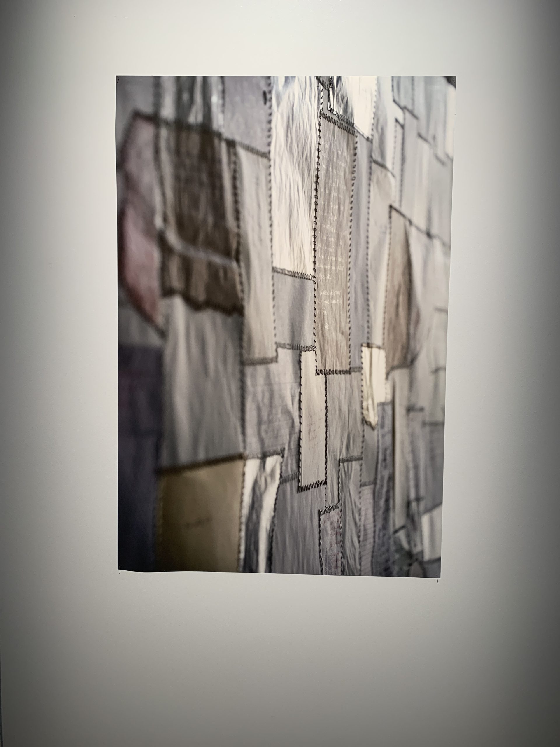 L’œuvre qui donne son titre à l’exposition, « Suspension », montre une aiguille de couture à moitié enfoncée dans un grand morceau de carton blanc flottant dans l’espace. Est-ce un drapeau blanc, ou une question lancée à soi-même, comme celle (« accepter ? ») que l’artiste a glissé dans sa courtepointe ?
