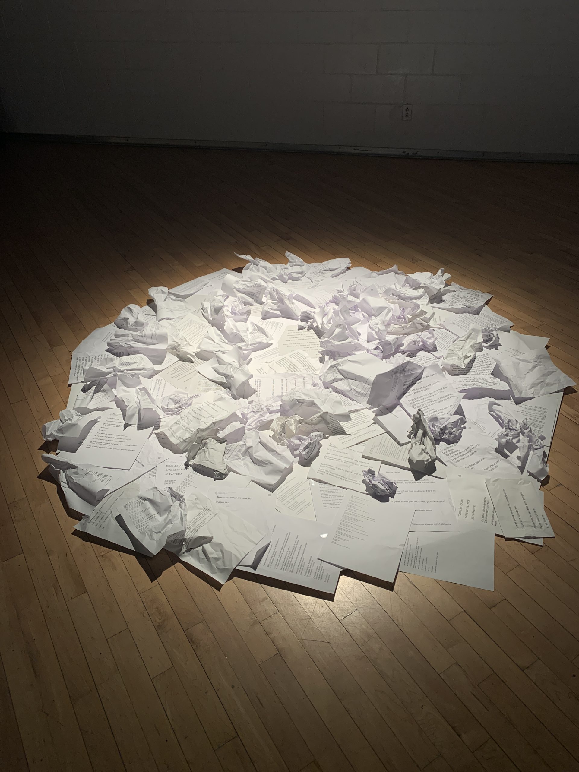 Il aura fallu le travail du temps et des mots, il aura fallu tout dire, tout formuler dans un dialogue imaginaire adressé à cet autre absent. Sur un ordinateur intégré à l’exposition, des courriels qui ne seront sans doute jamais envoyés se composent, s’effacent et se recomposent. Le principe est repris dans un monticule où s’empilent des lettres imprimées et chiffonnées, qui donnent à lire aveux, reproches, explications ou retours en arrière qui sont l’occasion de formuler un récit subjectif de l’union amoureuse : « J’ai reçu cette relation comme une compensation. Une réparation. » L’exposition met en scène la manière dont la parole, en dehors de tout échange véritable, puisque ce dernier reste probablement à l’état de fantasme, peut tout de même être une force agissante – qui agit sur soi, qui fait cheminer.