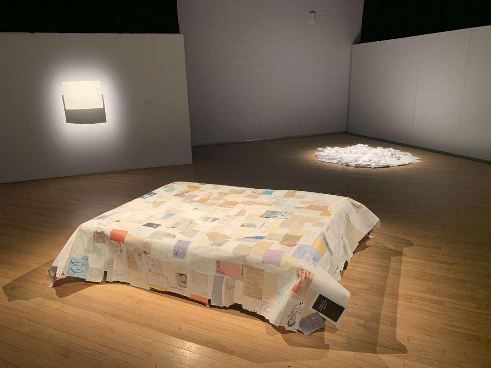 Présentée à la maison de la culture du Plateau-Mont-Royal après un passage en Suisse en 2016, Suspension est une installation artistique intégrant différents médiums et « mettant en scène le temps suspendu », celui de la transition et de la résilience qui naît de nos grands bouleversements intimes. « La Mue », une base en bois figurant un lit et recouverte d’une grande courtepointe de mots couchés sur le papier et patiemment cousus, rapiécés, reliés, constitue la pièce maîtresse de cette exposition,. Un lit à lire donc, « presque un livre ouvert », ainsi que le formule Jennifer Alleyn lors de l’un de nos échanges à propos de l’œuvre. Les visiteurs et visiteuses inventent leur propre parcours à travers ces mots qui expriment tour à tour la colère, la solitude, le doute, la constatation ou l’appel lancé dans le vide. L’artiste utilise un langage nu, sans coquetterie, mais avec lequel elle a tenté d’exprimer l’impossibilité de dire, « bataille, toujours recommencée, entre le désir et le dit. »