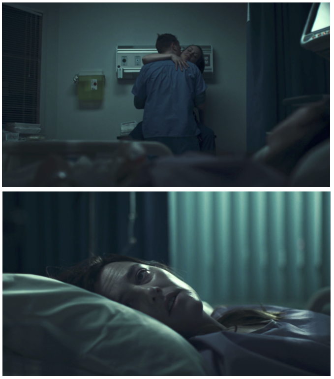 Non sans humour, Audrey ouvrira les yeux lors d’une scène d’intimité entre un infirmier et une préposée, couple adultère de surcroît, qui utilisent la chambre privée de la comateuse comme lieu de rencontre. Éclairés par le clair de lune, les deux amants se sentent soudain épiés, tirent les rideaux, entendent des bruits, jusqu’au moment où ils font le constat, irrévocable : Audrey est consciente. Derrière cet œil vitreux et ce visage insondable, toute une vie est en train d’émerger des profondeurs pour revenir à la surface.