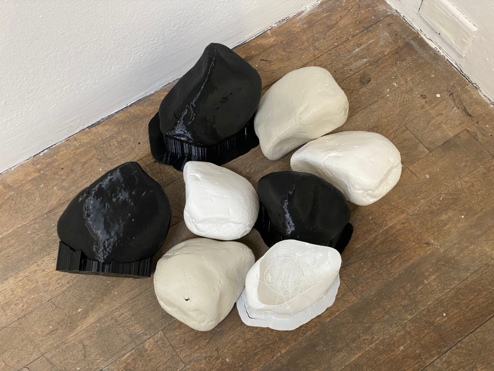 Tout au long de l’exposition, des objets personnels, des pierres et des végétaux cohabitent avec des outils technologiques. Par moment, leur union les rend difficiles à départager. C’est le cas des pierres, parfois réelles et d’autres fois imprimées à l’aide d’une imprimante 3D, qui sont parsemées en petits tas à travers la salle. Celles-ci peuvent aussi avoir un double rôle, puisqu’elles servent traditionnellement à montrer le passage du temps tout en faisant office, dans l’exposition, de haut-parleurs à souvenirs.