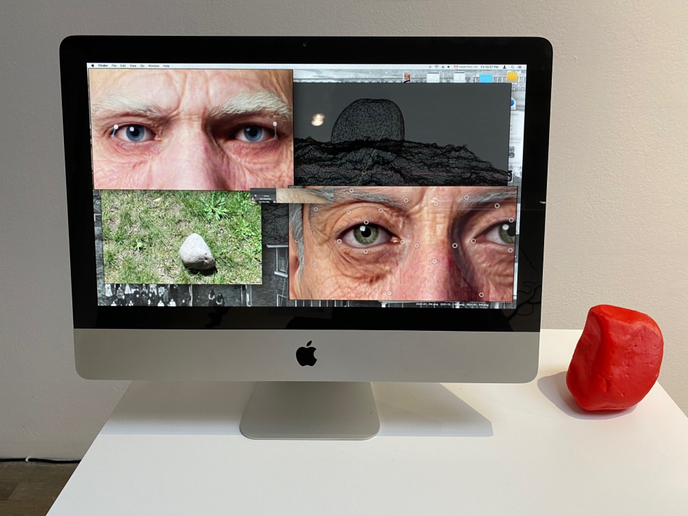 Un ordinateur et des objets rouges vifs attirent tout de suite mon attention. Sur l’écran, deux regards d’hommes. Quatre yeux et autant de pupilles sont scannés millimètre par millimètre, tandis qu’en arrière-plan la modélisation de pierres 3D semble naître directement de leurs regards. La trame narrative, disponible en format papier à l’entrée du centre et sur le site Web d’OBORO